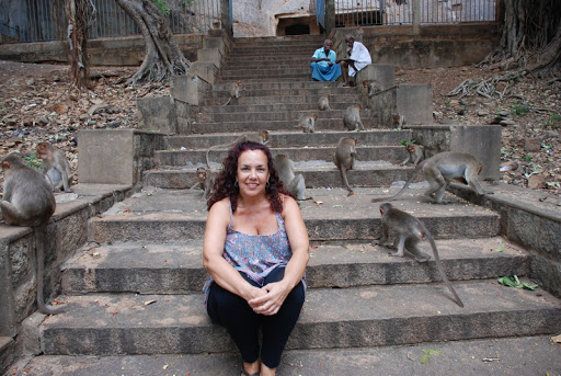 Por la tarde nos desplazamos hasta donde vimos una cueva excavada en una montaña, donde había una manada de unos 30 monos, saltando entre los arboles, escaleras y corriendo entre los que allí estábamos.