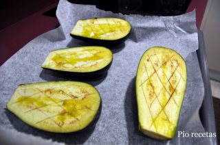 Bueno lo primero será cortar por la mitad 4 berenjenas medianas (lavadas y se le quita el pedúnculo), se hacen unos cortes con el cuchillo y se añade sal y un chorrito (poco) de aceite. Por último se ponen al horno a 180ºC, 40 min. Cuando estén doradas (no quemadas) y se pinchen fácil con el tenedor se separan y se dejan enfriar.