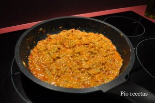 A continuación se pelan 4 dientes de ajos y se cortan en lascas. Se toma una cebolla y se pica en medias lunas y luego a la mitad. En una sartén se añade aceite que cubra todo el fondo y cuando este caliente se añaden los ajos hasta que se doren (no quemados) y luego le añades la cebolla hasta que se poche (color canelito). Se le añade 1 tomate grande picado en dados pequeños y 4 cucharadas de salsa de tomate.