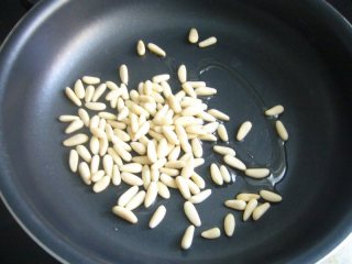 Por otro lado se fríen, en muy poco aceite (1 cda), piñones (si no se tienen pues almendras, anacardos, pistachos.) hasta que estén tostados (no quemados). La berenjena se corta en bastones y se pela la piel negra que se quita y los bastones resultantes se cortan en tacos. Ahora se coge una fuente de cristal y se mezcla todo en ella.