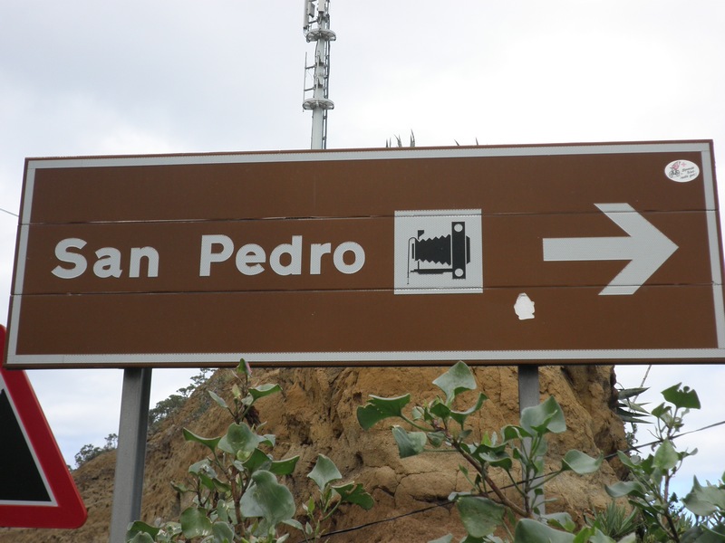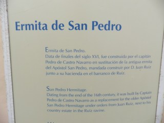 Saliendo de la hacienda hay varios caminos. Nosotros visitaremos a la vuelta el camino que lleva a Madre del Agua y al caserío del Mayorazgo. Por tanto, tomaremos el que asciende hasta el Mirador de San Pedro. En el lugar hay un restaurante y una señal de información que indica los datos más importantes de la historia de este lugar. Bajo el mirador desciende un camino ancho y empedrado resguardado por una valla de madera que pasa por delante de la Ermita de San Pedro, del siglo XVI, que alberga en su interior una talla barroca del Apóstol San Pedro.