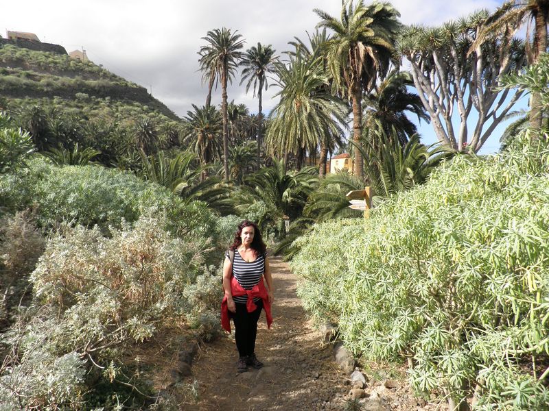 Nuestro camino, ahora de tierra, nos adentra en la Rambla de Castro que es un espacio natural protegido de 45 hectáreas compuesto por un enclave de gran valor paisajístico donde convive un precioso palmeral de Palmeras Canarias ( Phoenix canariensis ) con algunos ejemplares de Drago ( Dracaena draco ), junto a otras especies vegetales. Desde lo alto se observa la playa de Castro y al fondo la hacienda de los Castro.