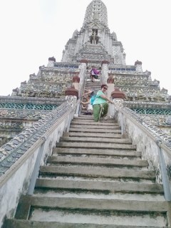 Tomamos un taxi que nos llevó hasta el Wat Arun o templo del amanecer, (50 bahts) que está enfrente del Palacio real, pero en el lado opuesto al rio Chao Phraya. El nombre procede de la diosa india del amanecer, Aruna.