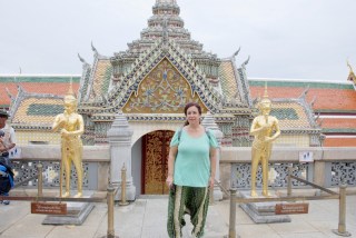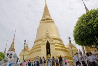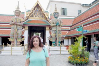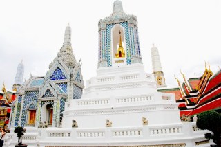 Nos dejó muy cerca de la entrada del Gran Palacio, Phra Borom Maha Ratcha Wang, (400 baths). El acceso al Gran Palacio de Bangkok se realiza por la Puerta Viseschaisri. El complejo, que forma el Gran Palacio de Bangkok, puede dividirse en 4 zonas: el patio exterior, el patio central, la zona de los Templos el Wat Phra Kaew o Buda Esmeralda y por último la zona de la corte y los jardines privados. Tras entrar estaremos en la zona conocida como Patio exterior (Khang Na). Esta zona está compuesta por un gran jardín verde, unos edificios oficiales a mano derecha (donde muchos de ellos ahora son museos o son utilizados para otras funciones, como por ejemplo consigna y alquiler de ropa). Al final del patio se encuentra la zona de recepción (Chakri Maha Prasat) un imponente edificio de color blanco donde está situada la taquilla y el acceso a los templos y al templo del buda esmeralda.