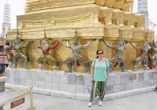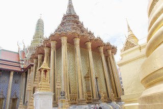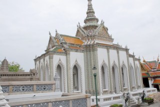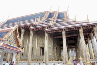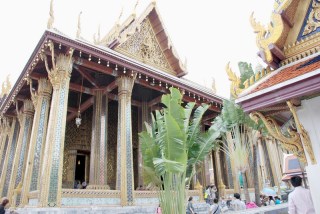De frente nos encontramos con el templo principal, el Wat Phra Kaeo, donde se encuentra el bot, el lugar más sagrado del recinto y donde se encuentra el buda esmeralda, realmente de jade. Obviamente no se puede entrar con zapatos y no se pueden hacer fotos, etc…sino desde el exterior. Maravillosa marquetería de nácar embellece puertas y ventas y una serie de garudas (animal mitológico mitad humano, mitad ave) rodea todo el edificio.