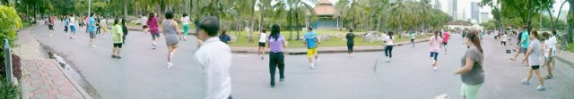 El parque Lumphini es una extensión arbolada muy vasta, donde destacan los lagos con barcas, fuentes, piscina, canchas de tenis y dependencia para practicar otros deportes, sala de musculación al aire libre. Sobre todo gente haciendo gimnasia al ritmo de la música, dirigidos por varios monitores (creemos que gratis, todo). Mucha, mucha gente haciendo footing