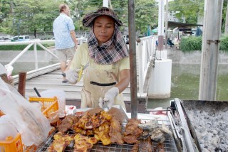 No habíamos comido todavía y este puestito callejero ofrecía una especie de pollo asado muy rico. Los Khlong, son canales navegables que se distribuyen por toda la ciudad y que permiten mover mercancía o dar paseo a los turistas