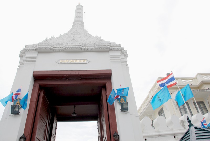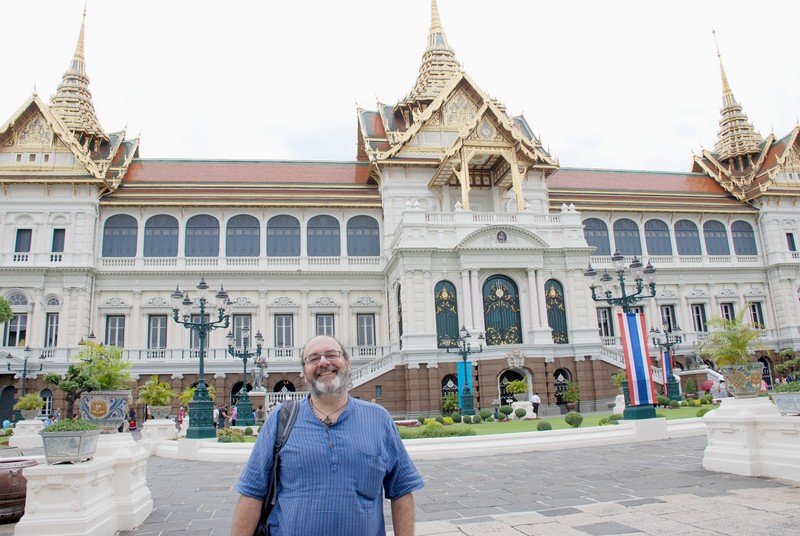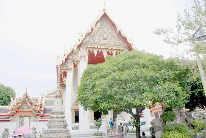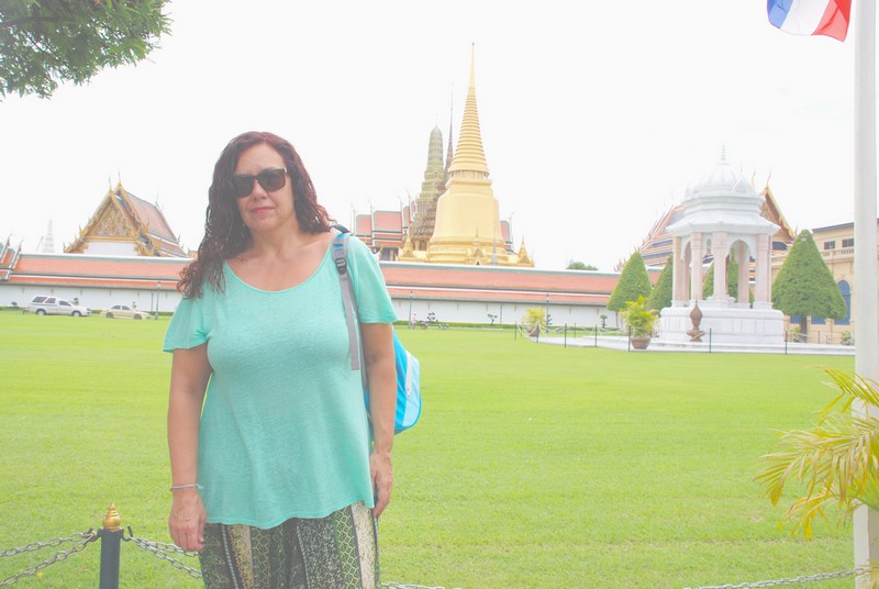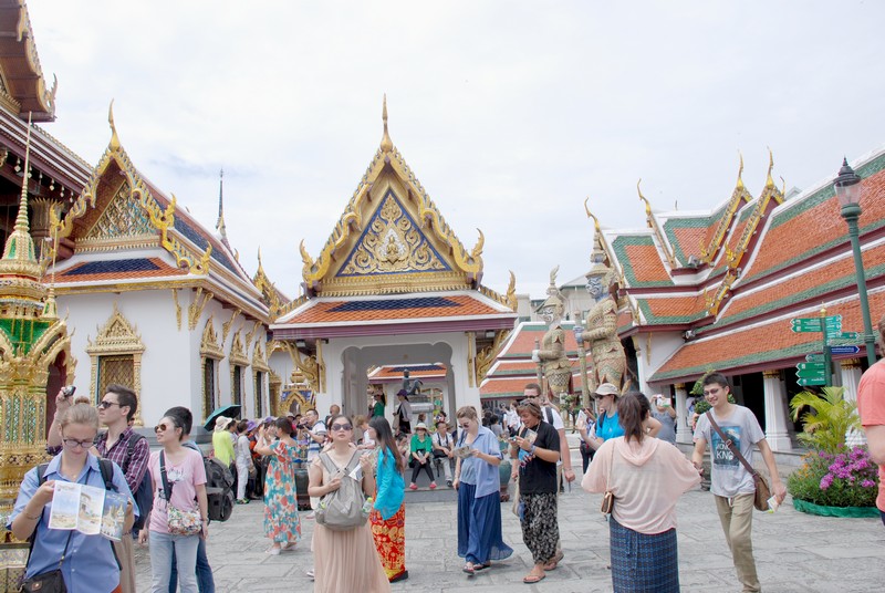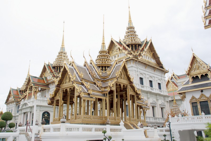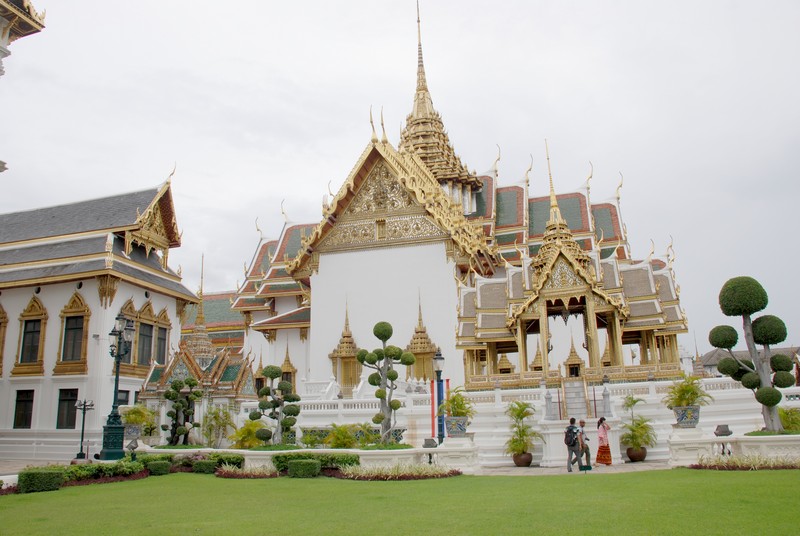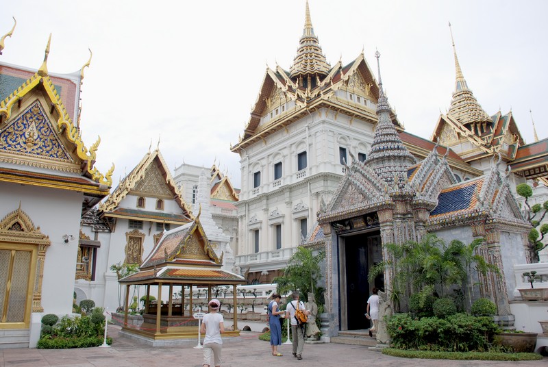 Nos dejó muy cerca de la entrada del Gran Palacio, Phra Borom Maha Ratcha Wang, (400 baths). El acceso al Gran Palacio de Bangkok se realiza por la Puerta Viseschaisri. El complejo, que forma el Gran Palacio de Bangkok, puede dividirse en 4 zonas: el patio exterior, el patio central, la zona de los Templos el Wat Phra Kaew o Buda Esmeralda y por último la zona de la corte y los jardines privados. Tras entrar estaremos en la zona conocida como Patio exterior (Khang Na). Esta zona está compuesta por un gran jardín verde, unos edificios oficiales a mano derecha (donde muchos de ellos ahora son museos o son utilizados para otras funciones, como por ejemplo consigna y alquiler de ropa). Al final del patio se encuentra la zona de recepción (Chakri Maha Prasat) un imponente edificio de color blanco donde está situada la taquilla y el acceso a los templos y al templo del buda esmeralda.