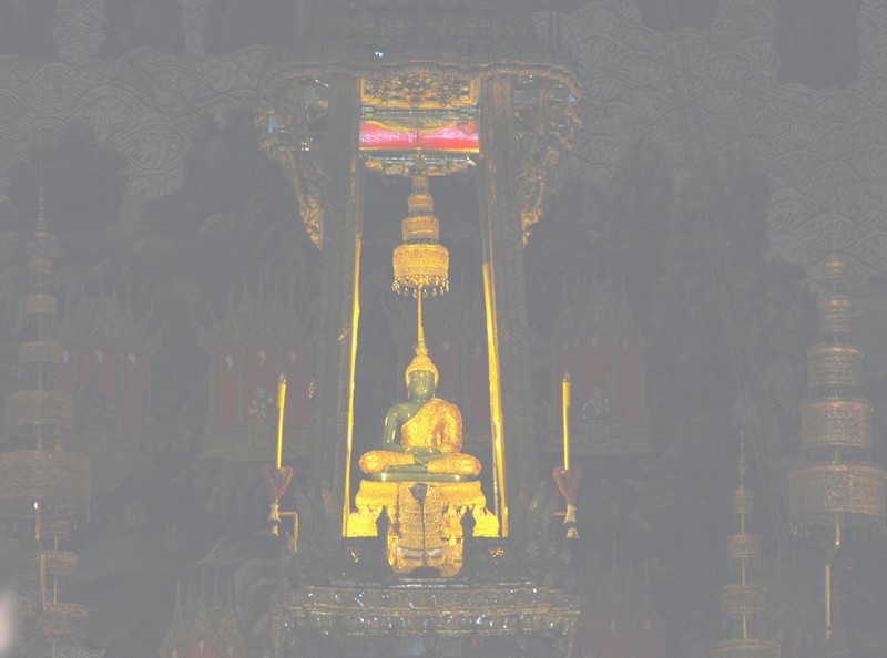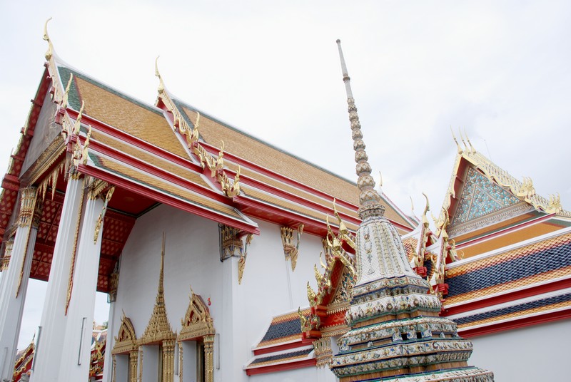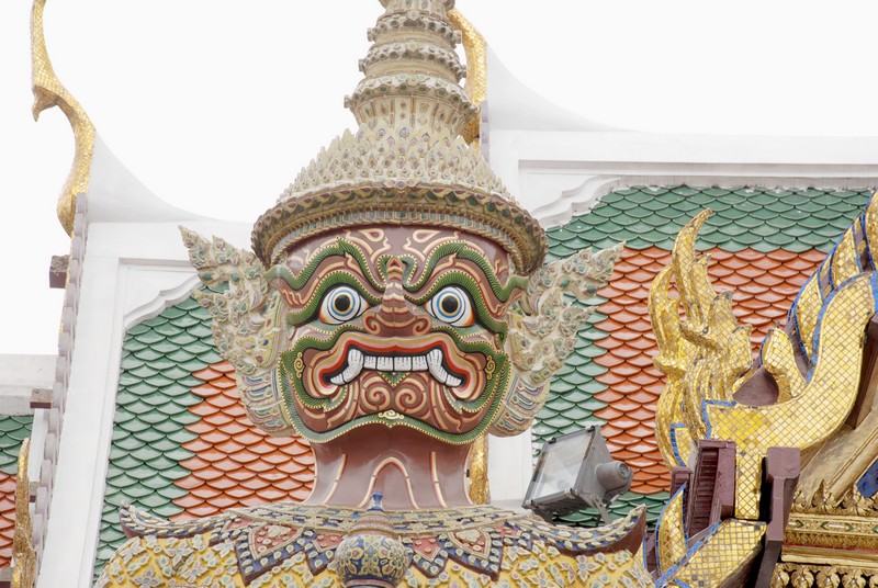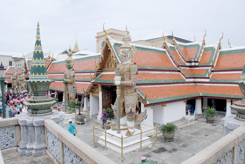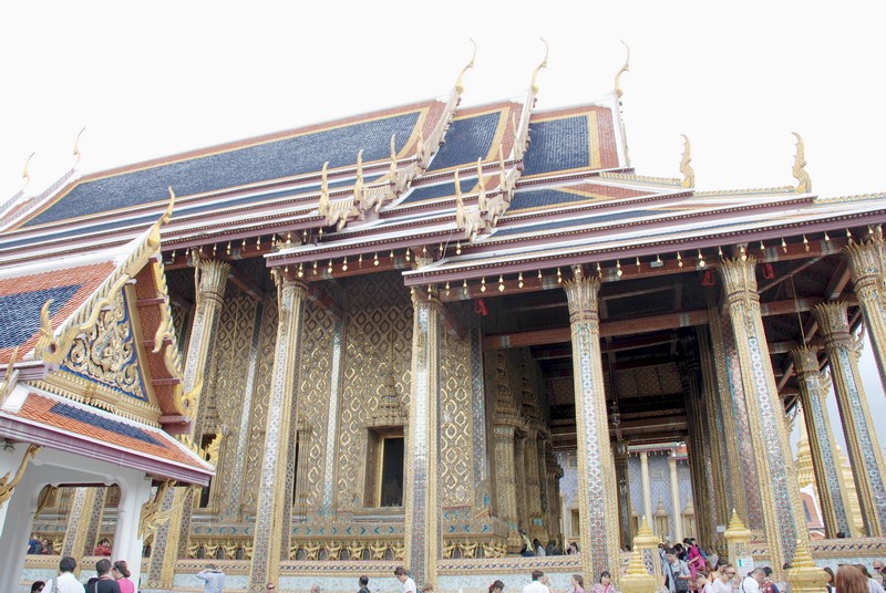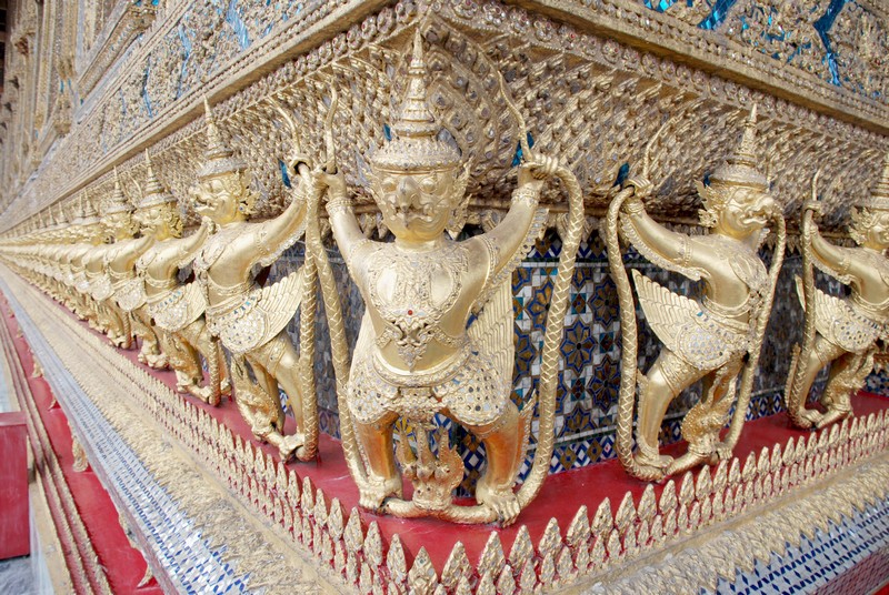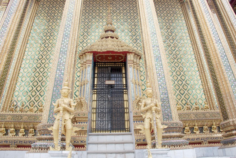 De frente nos encontramos con el templo principal, el Wat Phra Kaeo, donde se encuentra el bot, el lugar más sagrado del recinto y donde se encuentra el buda esmeralda, realmente de jade. Obviamente no se puede entrar con zapatos y no se pueden hacer fotos, etc…sino desde el exterior. Maravillosa marquetería de nácar embellece puertas y ventas y una serie de garudas (animal mitológico mitad humano, mitad ave) rodea todo el edificio.