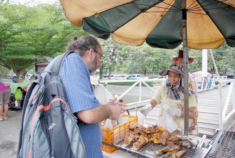No habíamos comido todavía y este puestito callejero ofrecía una especie de pollo asado muy rico. Los Khlong, son canales navegables que se distribuyen por toda la ciudad y que permiten mover mercancía o dar paseo a los turistas