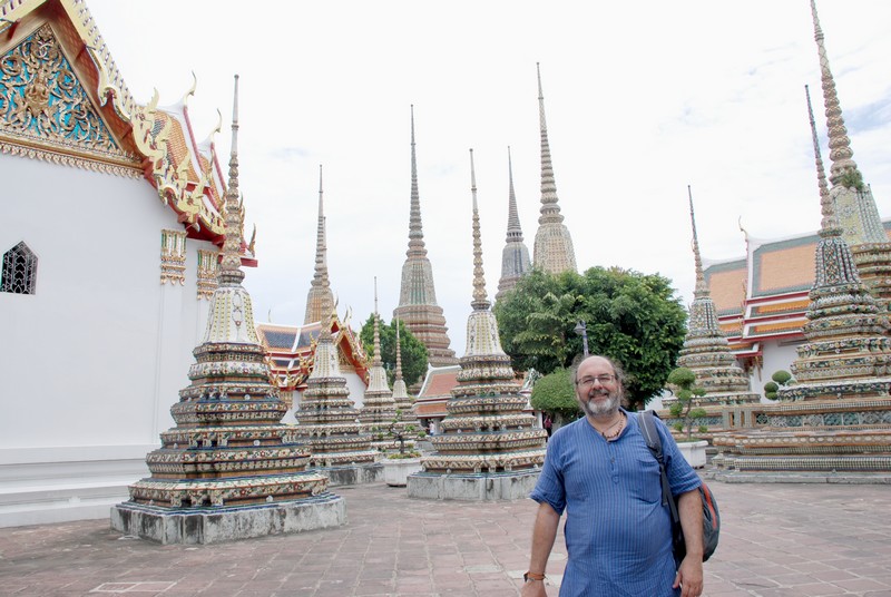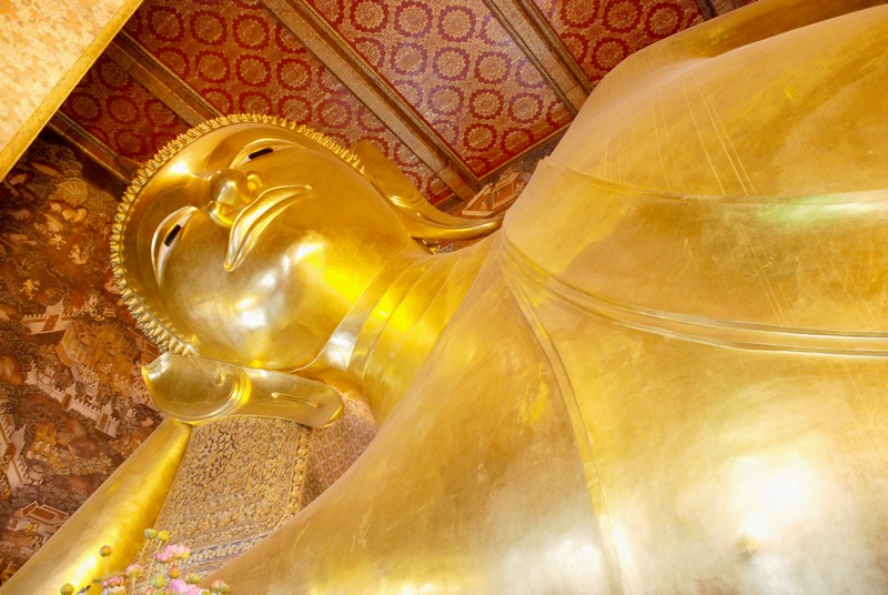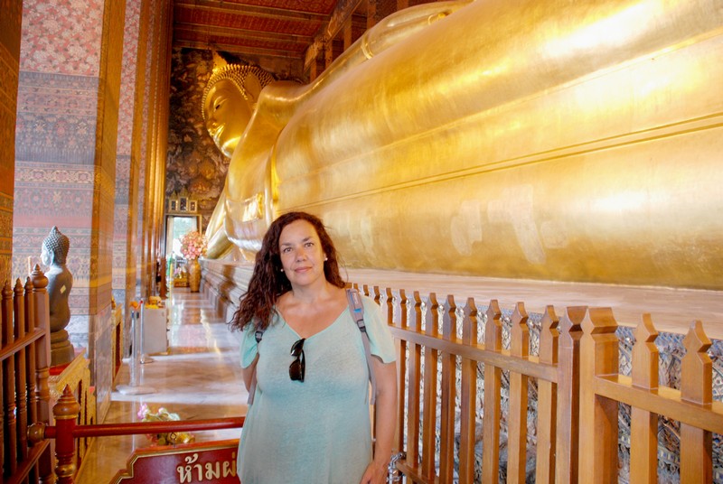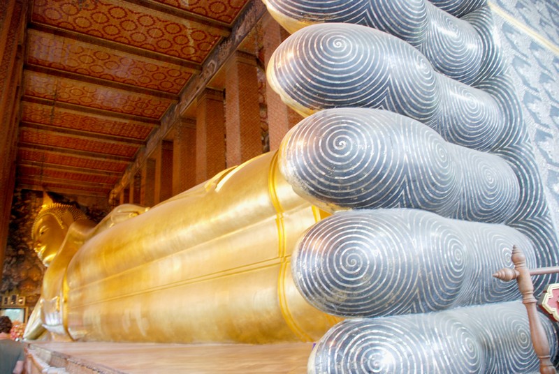 Después del esta visita nos dirigimos al Wat Pho o Templo del Buda yacente (50 baths). Mide 45 m de largo. La posición acostada precede a la llegada del nirvana.
