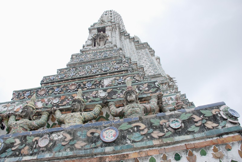 Las vistas desde la parte alta del Prang sobre la ciudad de Bangkok son grandiosas. Mide 114 m de alto. Está totalmente cubierto de fragmentos rotos de porcelana