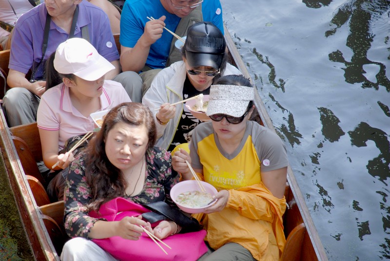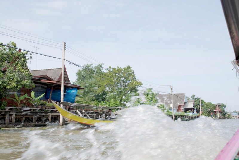 El recorrido comienza por un paseo por los canales adyacentes al mercado, unos 20 min. La velocidad que alcanza la barquita es increíble, dado que el canal no mide más de 3 m y hay otras embarcaciones a su alrededor. Por tanto, es normal que cuando la ola que produce la otra barca te llega haga bambolear tu barca y entrar agua.
