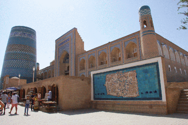 Muy cerca se encuentra el complejo Islam Khoja, La Madrasa y el precioso Minarete, edificado en 1901 en ladrillo con franjas azules que se ensanchan hacia lo alto, tiene casi 45 metros y es el más alto de la ciudad. A su lado está la Madrasa que hoy alberga el Museo de Artes Aplicadas.