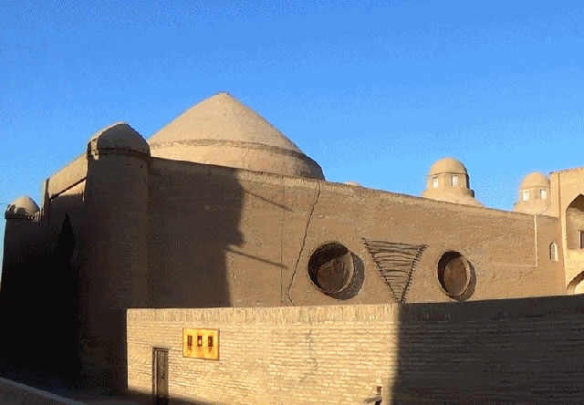 Llegamos a la zona Palvan Darboza o puerta oriental de la ciudad, la Puerta Este o Ichan Kala reconstruida en 1804; rematada con troneras y torres laterales que cruzan la muralla de la ciudad. En los nichos, antaño se encerraban a los esclavos. En sus puertas se anunciaban las ejecuciones, y los esclavos rebeldes eran “clavados” por las orejas en las maderas para escarnio público. A poca distancia está la Mezquita Ak ó blanca de 1838, incluye una sala de cúpula rodeada de tres galerías, que es un lugar de culto con minarete y mihrab. El minarete está coronado por una cúpula con aguja. La sala central de tres lados está rodeada por los altos aiwanes(terrazas) con columnas. El atractivo principal de la mezquita son sus columnas de madera decoradas con maravilloso y único tallado. Las ventanas de la mezquita están decoradas con celosías caladas de ganch (material blanco similar al yeso).