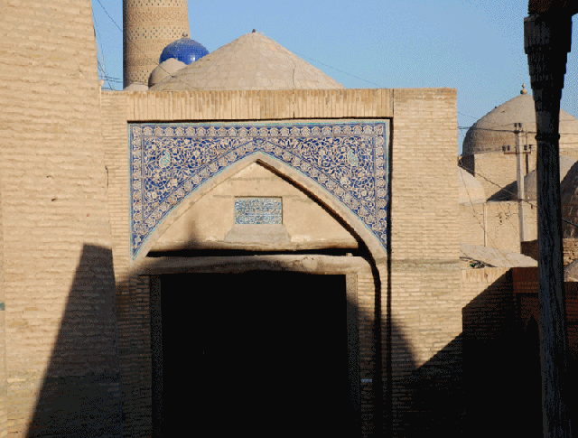 En frente a la Madrasa Amin Khan se encuentra la Madrasa Matinyaz Divanbegi, hoy convertida en un restaurante. Aquí quisimos comer pero nadie nos atendió así que nos fuimos. Entre ambos edificios se levanta un minarete inacabado, el Kalta Minor ó minarete corto, de color verde jade, construido en 1852, debía de haber sido el más alto, unos 70 mts. Parece ser que la muerte, en 1855, de Amin Khanfue la causa de que quedara inacabado. Pero según otras versiones maliciosas señalan que el muecín podría ver a las concubinas del patio del harén, que estaba enfrente y eso no le gustaba al Khan. Sus 68 escalones llevan hasta una plataforma con vistas de la ciudad. Por detrás de estos edificios se haya la construcción más antigua de Jiva; el pequeño Mausoleo de Said Allauddinque hacia 1303 era un maestro sufí que llegó a ser muy venerado.