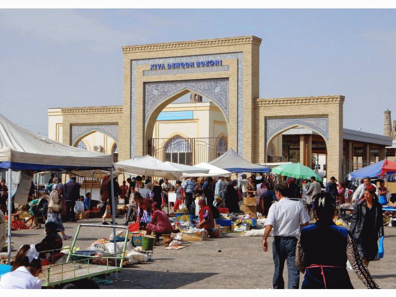 Al cruzar esta puerta uno se sumerge directamente en la cultura del bazar; el regateo, la compra, las miradas al género que se expone en los tenderetes, a las llamadas de los vendedores ataviados con sus ropas clásicas y multicolores. En este punto se compra el ticket (30€ todos y una cámara) para la entrada a los monumentos. No se puede acceder a los monumentos de forma individual, ni comprarlo en ningún otro sitio. Aunque no incluye la entrada al Mausoleo de Pakhlavan Mahmud, la subida a la terraza de la ciudadela, Kunya Ark (3000 sums) ni la subida a los minaretes de la Mezquita Juma ni al de Islam Khodja. Lo usamos durante tres días.