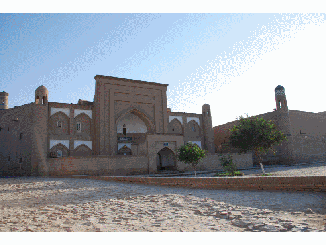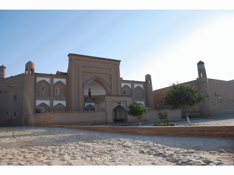 En la misma plaza se encuentra la MadrasaMohammed Rakhim Khan, en ella se encuentra el Museo del Vestido y Armas locales, así como numerosas fotos del siglo XIX. Fue construida en 1876 por orden de Seyid Muhammad Rahim-II(1863-1910). El edificio es rectangular de dos pisos y cuenta con un patio de cuatro aiwan y pequeñas torres en sus esquinas. En las alas se abre una galería de cinco haces de nichos que flanquean su portal. Tiene 125 khudjras (celdas), destinados a 260 estudiantes, cada una consistía en dos habitaciones y en el segundo piso disponia de una sala y la loggia, que daba a la fachada. Las khudjras están techadas con cúpulas «Balkhi«. Hay dos curiosidades; en el patio interior se ejercita el Circo Darboz con un espectáculo de equilibrista y la otra, en el muro exterior sur de la madrasa nos podemos fotografiar con Katya, un camello símbolo de Khiva.