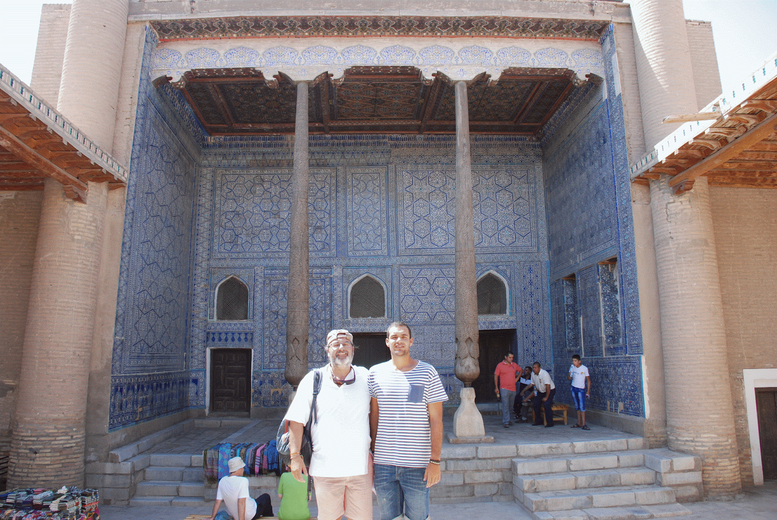 Saliendo nuevamente a la c/ Palvan Kori, nos inundan los tenderetes de los vendedores y destaca al fondo un minarete de 33 metros de altura y 81 escalones de la Mezquita de los Viernes o Juma, fundada en el s. X y reconstruida en el s. XVIII, conserva en su amplia sala de 213 columnas de madera, algunas originales, con paredes de ladrillo sin decoración y techo plano con abertura central por la que se filtra una luz cenital que ilumina tenuemente la estancia dándole un halo de misterio y serenidad.