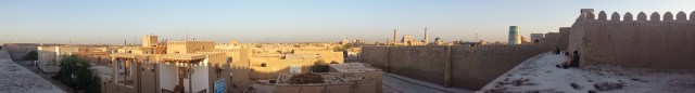 Lo mejor de Khiva es callejear, hay que dedicarle al menos una tarde, a caminar por la ciudad antigua, saludar a la gente sentada delante de sus puertas o ver baldear las entradas de las casas cuando atardece para refrescar el ambiente. La luz va bajando poco a poco y crea una atmosfera increíble. Es el momento para ascender a sus murallas y ver el atardecer. Accedimos por la puerta Bogcha Darvoza, puerta norte.