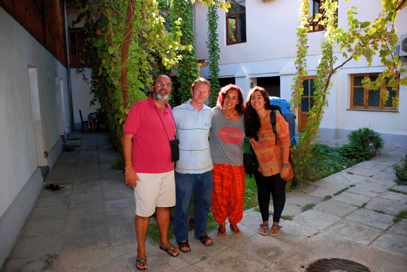 Cansados y hambrientos llegamos a Samarcandahabíamos reservado en el B&B Jahongir. Lo más destacable es su patio, cubierto de enredaderas y parras que dan sombra y frescor, como en un oasis en medio de un caluroso desierto. Sentado en la mesa-cama, leyendo un libro, organizando la visita, hablando con otros viajeros o simplemente haciendo una siesta es un remanso de paz. El personal era muy servicial y acogedor, dispuesto a informarte de todo y a solucionar todas tus peticiones. pero lo mejor es su ubicación a 5 minutos de la Plaza del Registán.