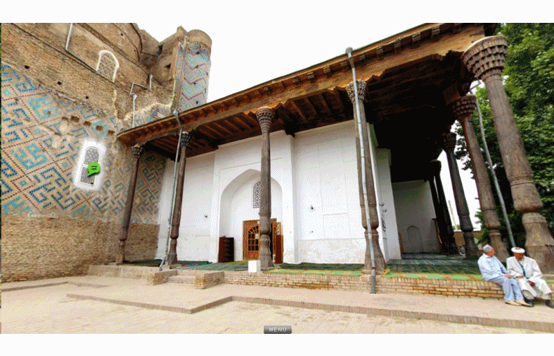 Nuestro conductor nos llevó al complejo Dorut Tillovat situado al sur de la ciudad. Destaca la Mezquita Kok Gumbaz, cuyo nombre significa “cúpula azul” y es la mezquita de los viernes, construida por Ulughbeken el año 1437 en honor a su padre Shah Ulughbek, hijo de Tamerlán. Se accede por un patio de frondosos árboles donde hay un minarete aislado para llamar a la oración. En el lado derecho se encuentra la mezquita, a la cual se ingresa por una puerta, adornada con inscripciones en mayólica de textos del Corán. Dentro una sala cuadrada rematada con una hermosa cúpula central de 46 metros de diámetro. En la actualidad es objeto de una lenta restauración ya que sus azulejos están bastante deteriorados.