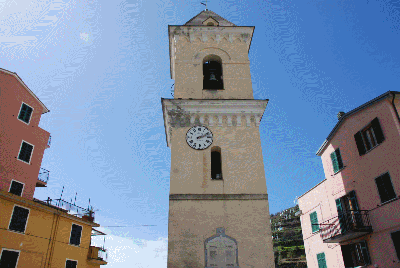 Detrás de la iglesia, una escalera larga y empinada nos lleva hasta una terraza ofrece unas vistas espléndidas de la marina de Corniglia y al fondo el pueblo de Manarola, así como los restos de las Fortificaciones Genovesas. Restos de un castillo y una torre poligonal levantada por los genoveses en 1556 para defenderse de las incursiones de los sarracenos están ahora integrados en el cementerio con vistas al mar.