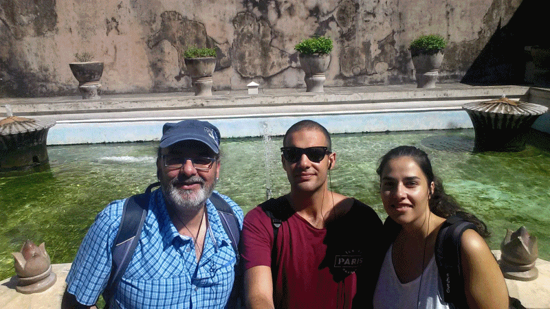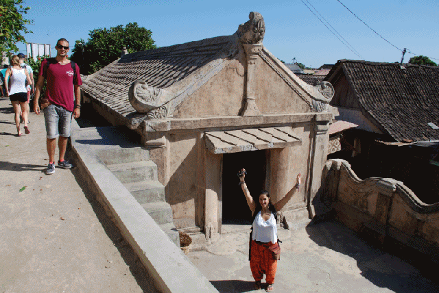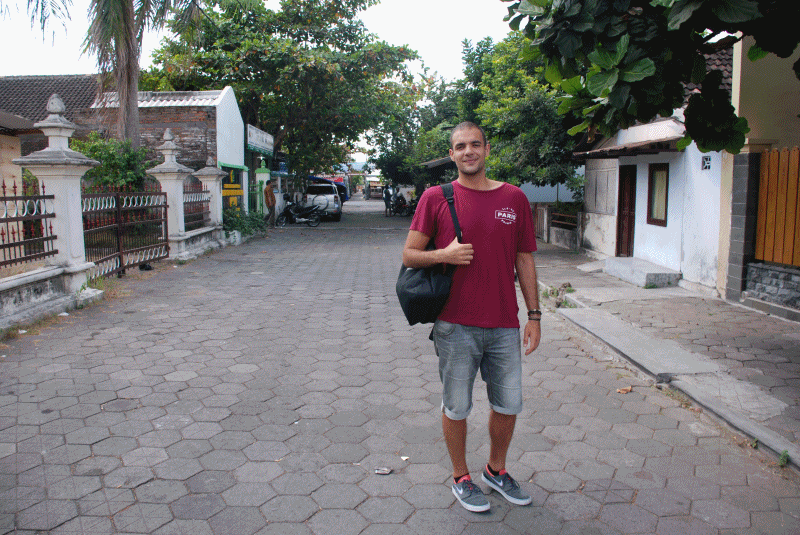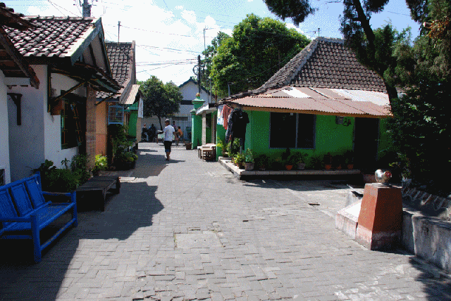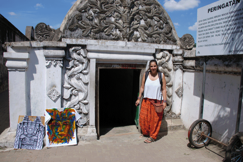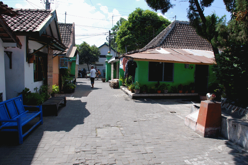 Ahora nos dirigimos al Palacio de agua o Taman Sari, para ello, hay que atravesar un asentamiento llamado Kampung Taman, cuyos residentes se dedican a la fabricación de batik y a la pintura tradicional. Un anciano sentado a la puerta de su casa, después del pertinente “hallo” y de decirle que tiene una preciosa jaula de pájaros, le preguntamos por la dirección del Palacio de agua, nos la indica y nos cuenta orgulloso, con un gesto de su mano, que es el dueño de esta zona y que estuvo trabajando en Holanda pero que ahora está jubilado, nos despedimos con el sempiterno “terima kasih” a lo que responde con el “sama, sama”. Continuamos callejeando hasta que nuevamente le preguntamos a un hombre a la puerta de su casa por la dirección y ante nuestra sorpresa inicial y la proverbial desconfianza occidental se ofreció a llevarnos hasta la entrada, resultó ser un guía del palacio de agua.