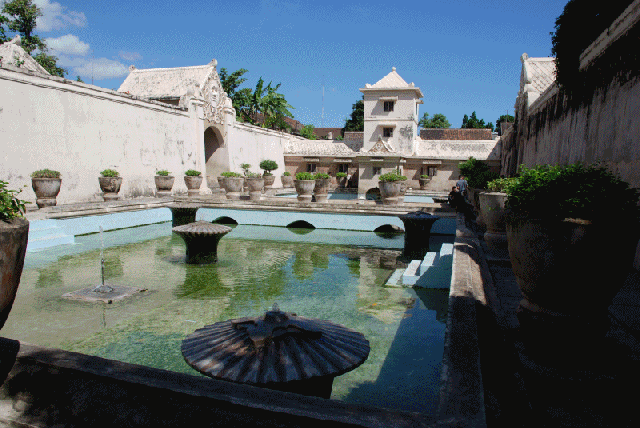 El Taman Sari fue construido como un jardín real para el Sultán Hamengkubuwono I (1755–1792). Hoy en día sólo queda el complejo balneario central y algún edificio bastante deteriorado. Para acceder al Umbul Pasiraman lo hacemos a través de un pasadizo subterráneo y llegamos a la puerta oriental llamada Gedhong Gapura Panggung, decorada con adornos de aves estilizadas y flores. La entrada presenta cuatro escaleras, dos en el lado oeste y dos en el lado este, decoradas con nagas. Después de la puerta nos encontramos con un patio octogonal donde hay varios edificios que antiguamente ocupaba la guardia.