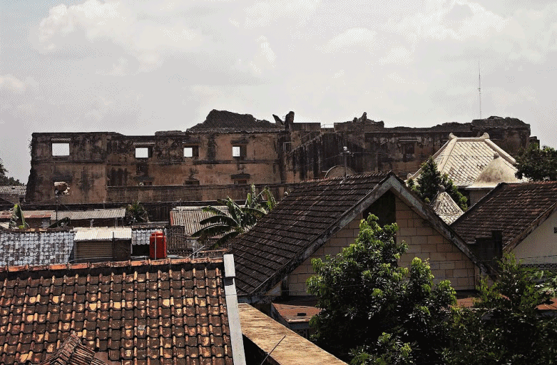 Llegamos al punto más alto, donde antiguamente se alzaba el castillo Kenongo, hoy en ruinas, desde aquí podemos hacernos una idea del complejo Taman Sari. Consistía en cuatro áreas distintas: un gran lago artificial (Segaran) con islas (en una de la cual estábamos) y túneles situados en el norte, un complejo de baños en el centro (Umbul Pasiraman), un complejo de pabellones y piscinas en el sur (Pasarean Dalem Ledok Sari) y un pequeño lago en el este. Es difícil visualizar que en el pasado esta zona era un lago artificial porque ahora está lleno de asentamientos por donde hemos venido caminando. De frente una fila de pequeños edificios, nos llama la atención, son los denominados Tajug, que funcionan como respiraderos o salidas de aire para el túnel subterráneo que salva el lago.