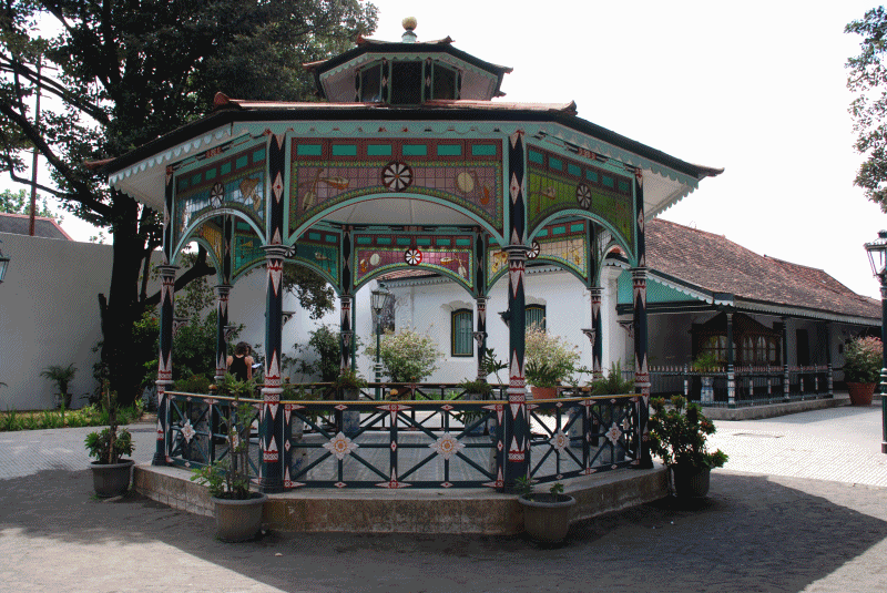 El recepcionista de nuestro hotel se ofreció a acercarnos hasta la entrada del Kraton. Bajo un sol de justicia nos condujo por las intrincadas callejas del recinto. Por delante de nuestros ojos, a modo de película, observábamos a través de las puertas semiabiertas de las humildes casas, escenas cotidianas; sobre jergones, casi su único mobiliario, madres peinando a sus hijos, chiquillos viendo la televisión absortos, mujeres haciendo la comida en infiernillos de carbón y hombres que duermen tirados en el porche. Continuamos nuestro periplo, pensando que para volver deberíamos haber dejado miguitas de pan, cuando de repente llegamos una explanada o plaza llamada Alun-Alun Lor, en cuyo centro destaca una cerca con dos waringin o bayanos sagrados, frente a ellos se encontraba la antigua entrada principal, Bangsal Pagelaran, el pabellón donde el sultán se sentaba a ver las paradas militares, ahora se utiliza para ceremonias musicales y de teatro. Unas escaleras te conducen hasta el Siti Hinggil, o “tierra elevada” y alberga el Manguntur Tangkil Halldonde se encuentra el trono y donde se llevan a cabo las coronaciones reales.