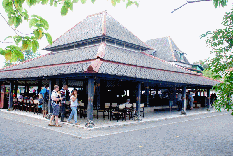En el de la derecha, Bangsal Trajumas, en este pabellón se realizan audiciones de gamelán, agrupación de música tradicional indonesia, constituida por instrumentos de percusión, xilófonos, etc..y representación de wayang, teatro de las sombras con marionetas o kulit, en este caso realizadas en madera, otros días hay también canto y poesía javanesa o danza clásica. En el de la izquierda, Bangsal Sri Manganti. De frente se abre la puerta Regol Donopratopo que es la entrada al Pelataram Kedaton o Patio Real, custodiado por dos Dwarapalas, denominados Cingkarabalael del este y Balaupata el del oeste.