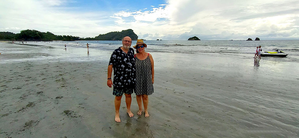 Regresamos porque se acercaba la hora del cierre y ya fuera del parque nos dirigimos a la playa Espadilla del Norte, frente al pueblo Manuel Antonio. Una playa de suave arena dorada, kilométrica, muy abierta y por tanto con oleaje que hace la delicia de los surfers y de otros practicantes de deportes náuticos. Muy concurrida porque es de acceso gratuito.
