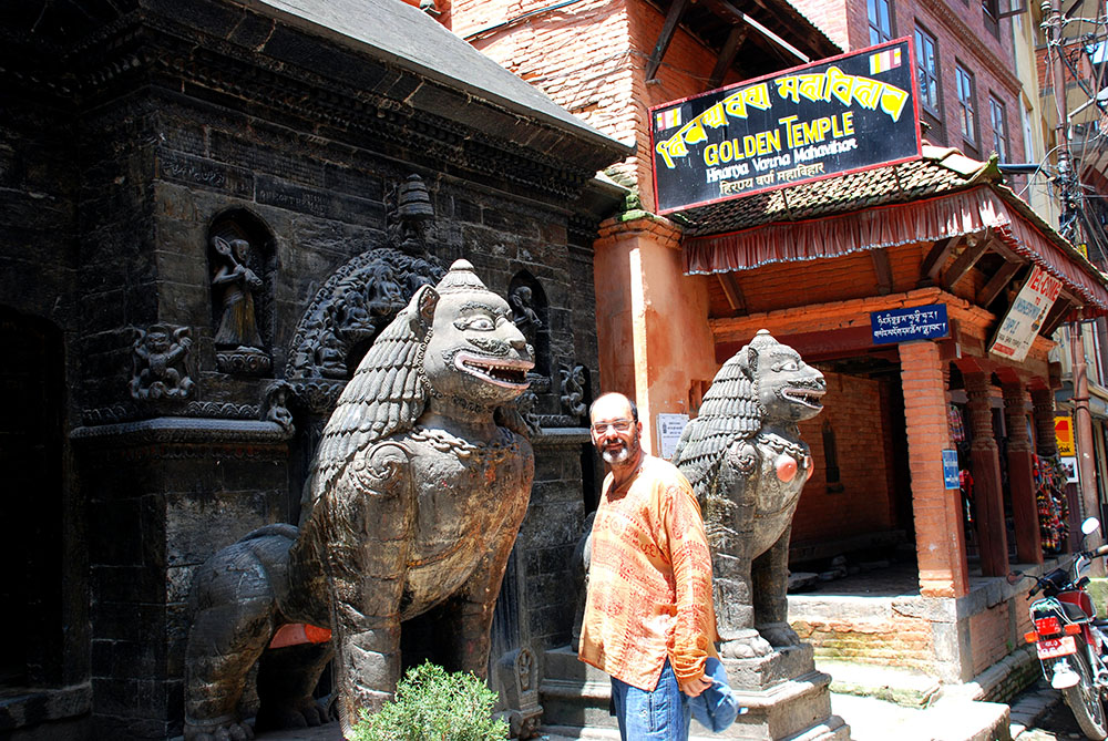 Nuestra última visita fue al Hiranya Varna Mahavihar, más conocido como Golden Temple, un vihara, monasterio budista del siglo XII muy venerado. Se entra por una puerta de piedra profusamente decorada, custodiada por una pareja de leones mitológicos también en piedra que dan acceso a un patio interior. En el centro encontramos un pequeño santuario que contiene un chaitya (swayambhu) rodeadas de iconos, estatuas y figuras religiosas. Detrás encontramos dos estatuas de elefantes que custodian la entrada a la pagoda de tres niveles, cuya fachada está cubierta por una gran cantidad de relucientes figuras budistas. Dentro del santuario principal hay una hermosa estatua del Buda Sakyamuniun (Siddhartha Gautama).