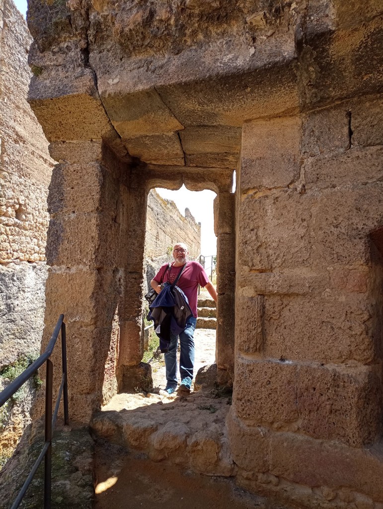 Bajando por la calle Prim llegamos a la trasera de la Puerta de Sevilla, su origen está establecido en el s. IX a.C. Los cartagineses construyeron un baluarte sobre la primitiva torre del siglo VIII a. C. En época de Augusto, reforzaron y reformaron la estructura levantada por los cartagineses con el conjunto de puertas que todavía hoy puede verse. Durante el periodo islámico se implementaron varios arcos de herradura de época Califal, s. X y de época Almohade, s. XII.