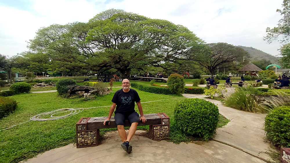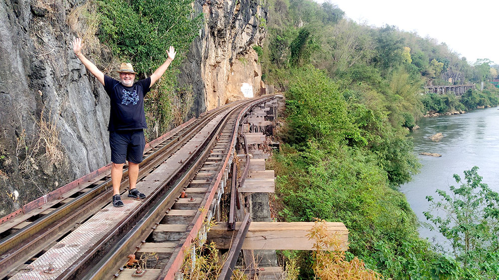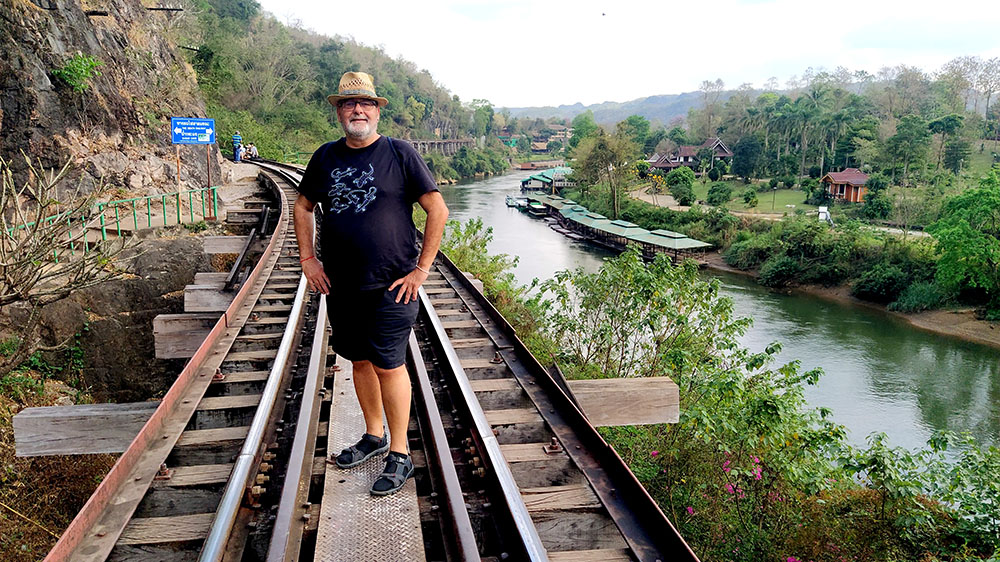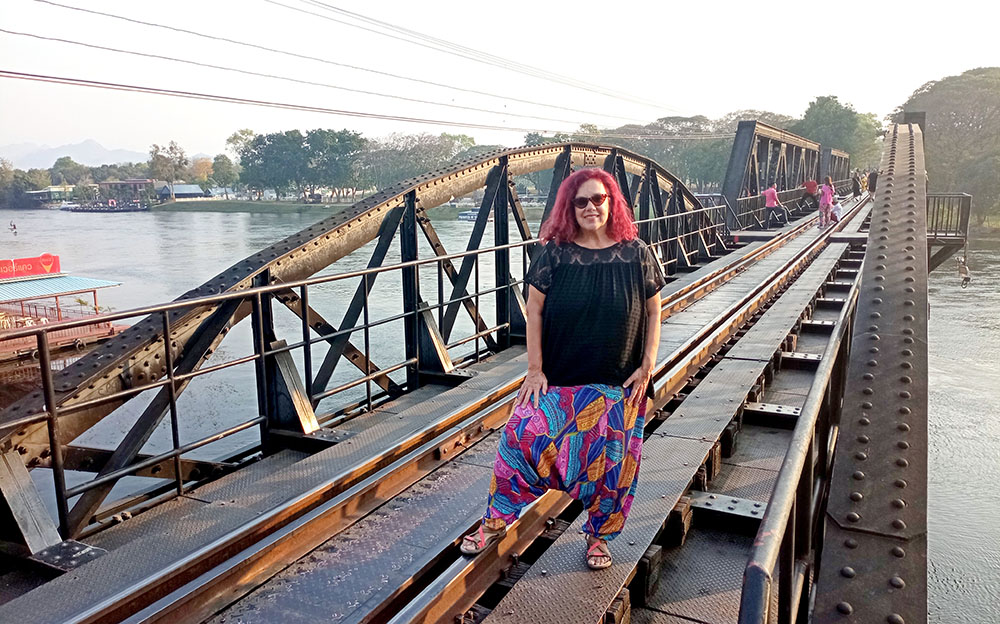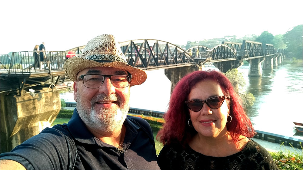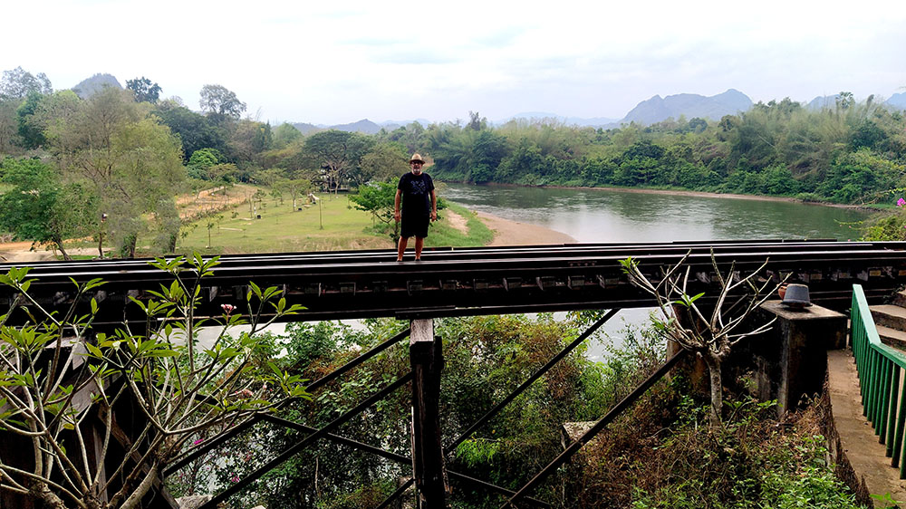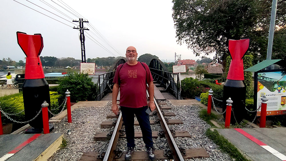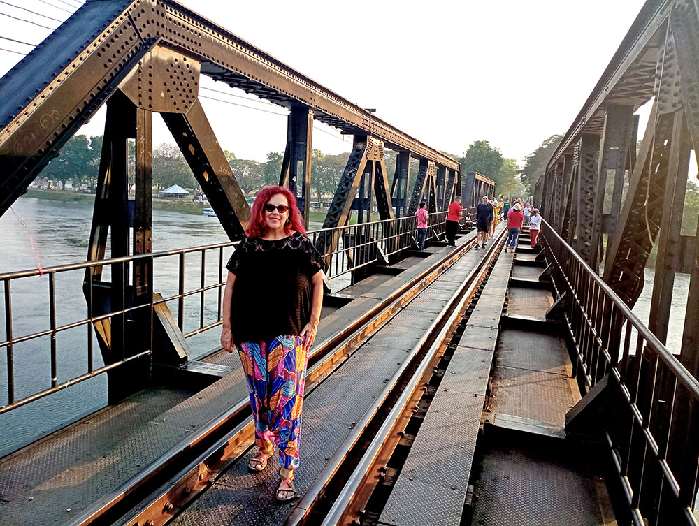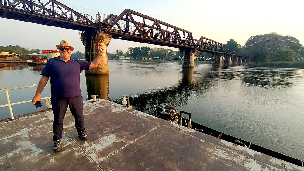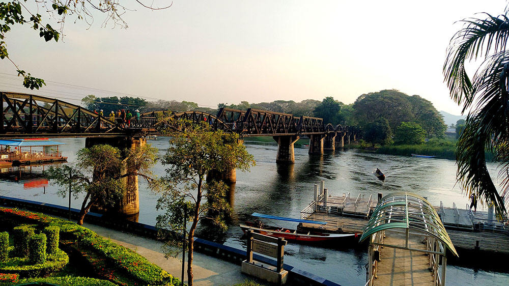 Atardecía en la ciudad de Kanchanaburi y a pocos pasos se levanta el puente sobre el río Kwai o Khwae, al que el director David Lean y los actores Alec Guinness y William Holden, recrearon en la película The Bridge on the River Kwai. Quién no ha silbado alguna vez la melodía de la Marcha del Coronel Bogey, que los prisioneros silbaban al desfilar de vuelta al campamento. La película recrea la historia real de la construcción de la línea del ferrocarril de Birmania o más conocido como el ferrocarril de la muerte de 1942 a 1943. El puente de 300 metros de largo fue construido por prisioneros de guerra de los japoneses durante la Segunda Guerra Mundial, y formaba parte de un proyecto destinado a unir Tailandia y Birmania, la actual Myanmar.