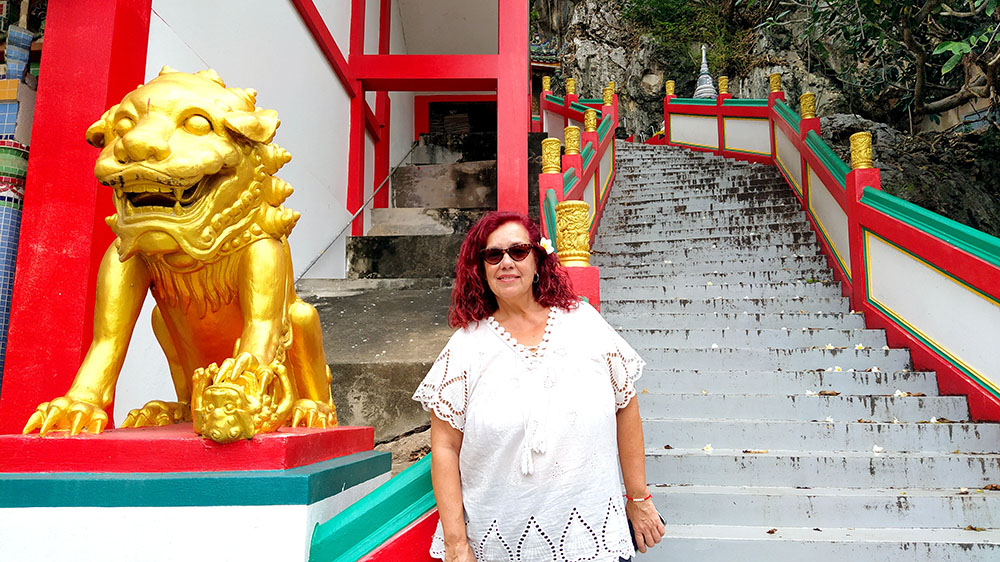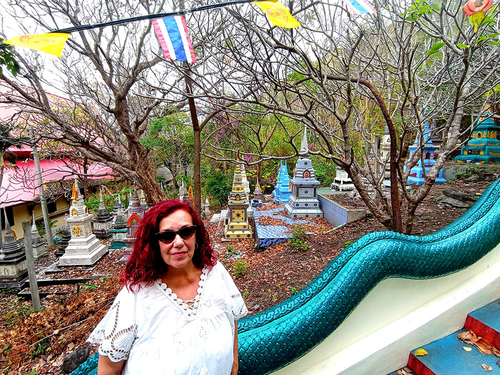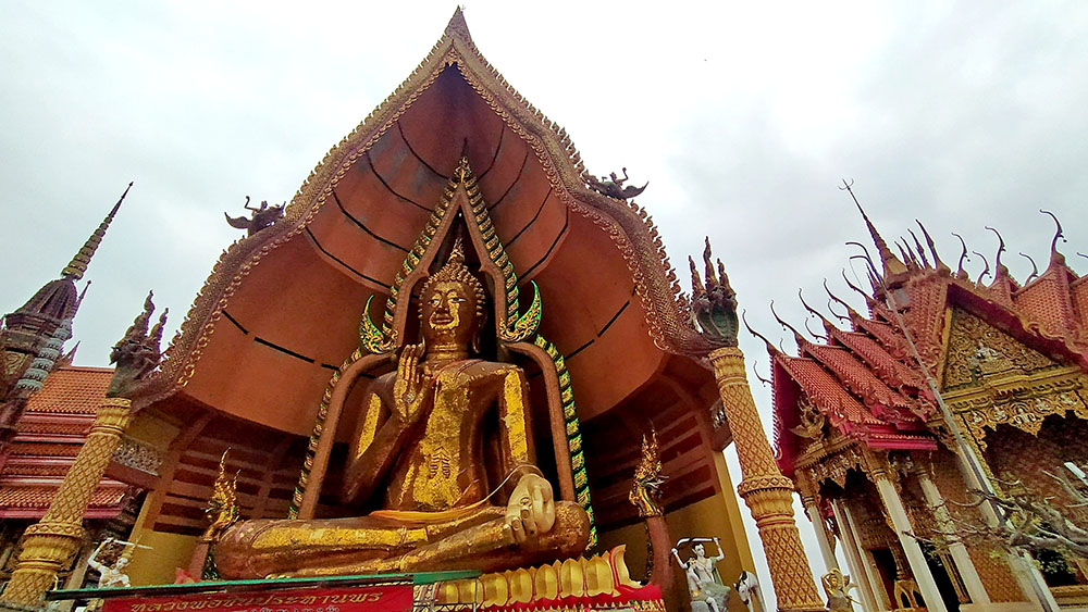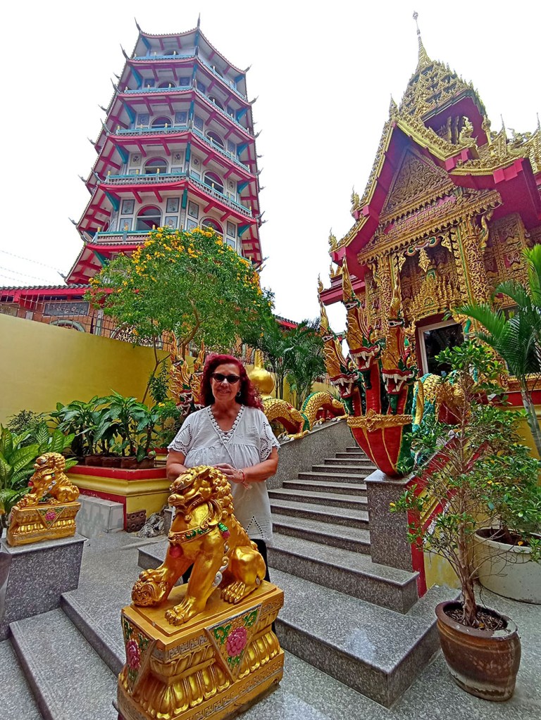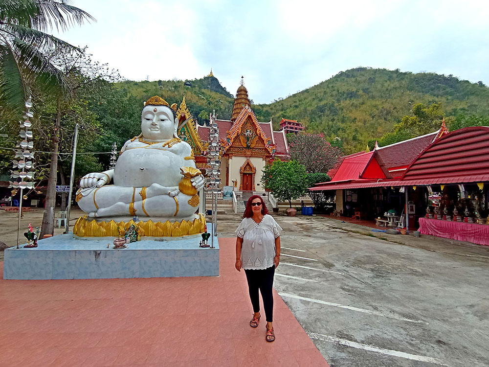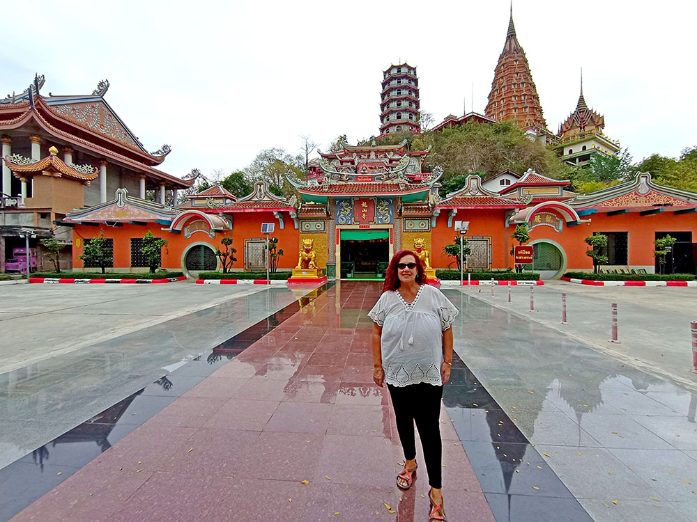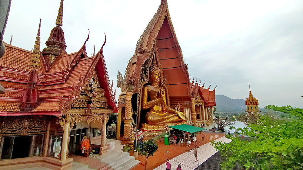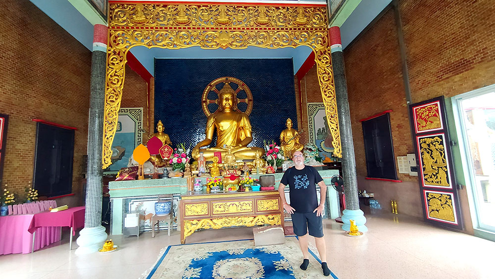 A la derecha de la estatua hay dos templos, mezcla de estilos tailandés y chino, donde los fervorosos creyentes realizan plegarias y ofrendas.