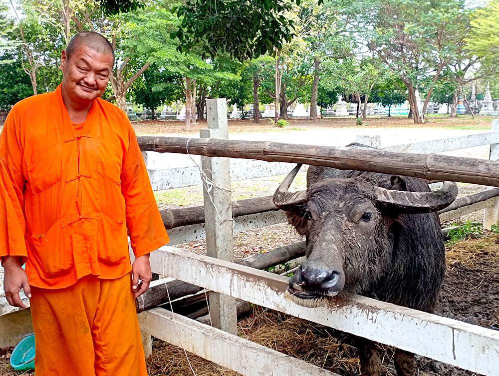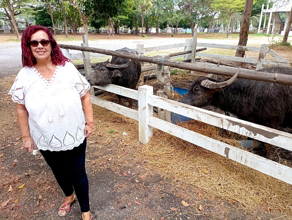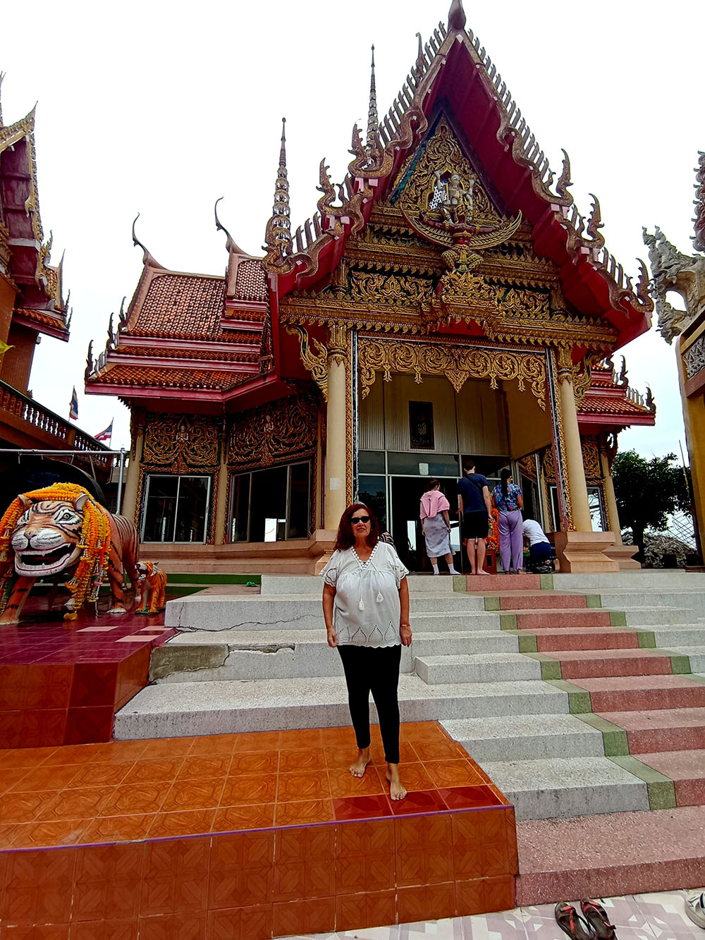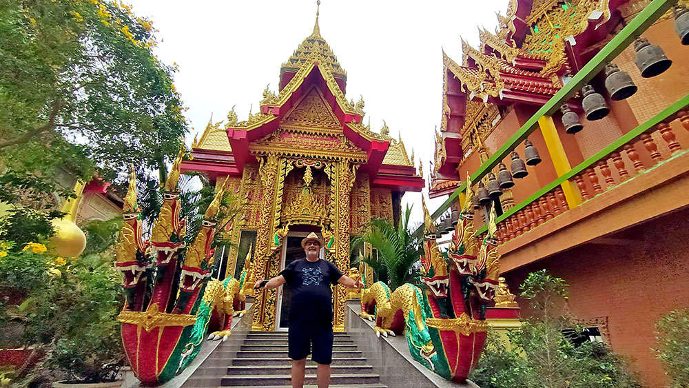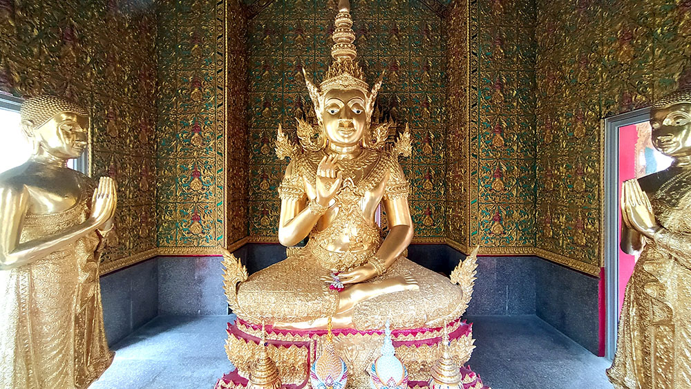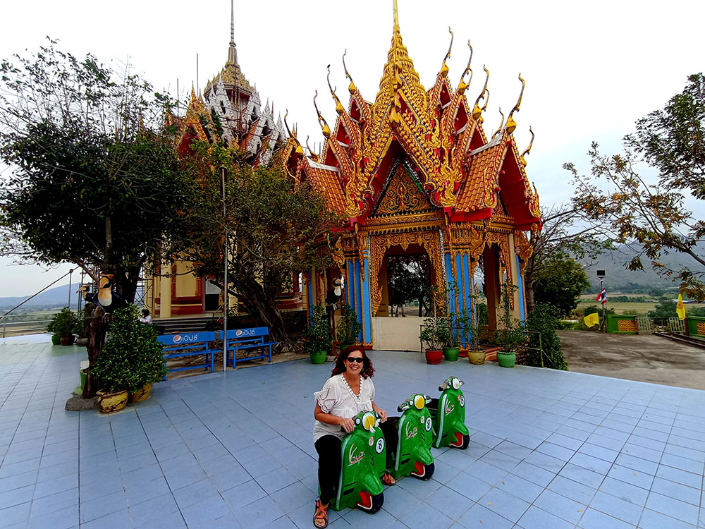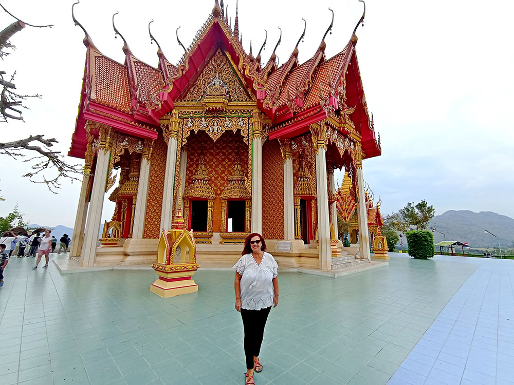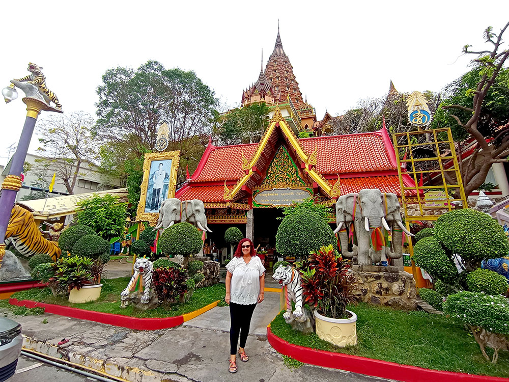 A la derecha de la estatua hay dos templos, mezcla de estilos tailandés y chino, donde los fervorosos creyentes realizan plegarias y ofrendas.