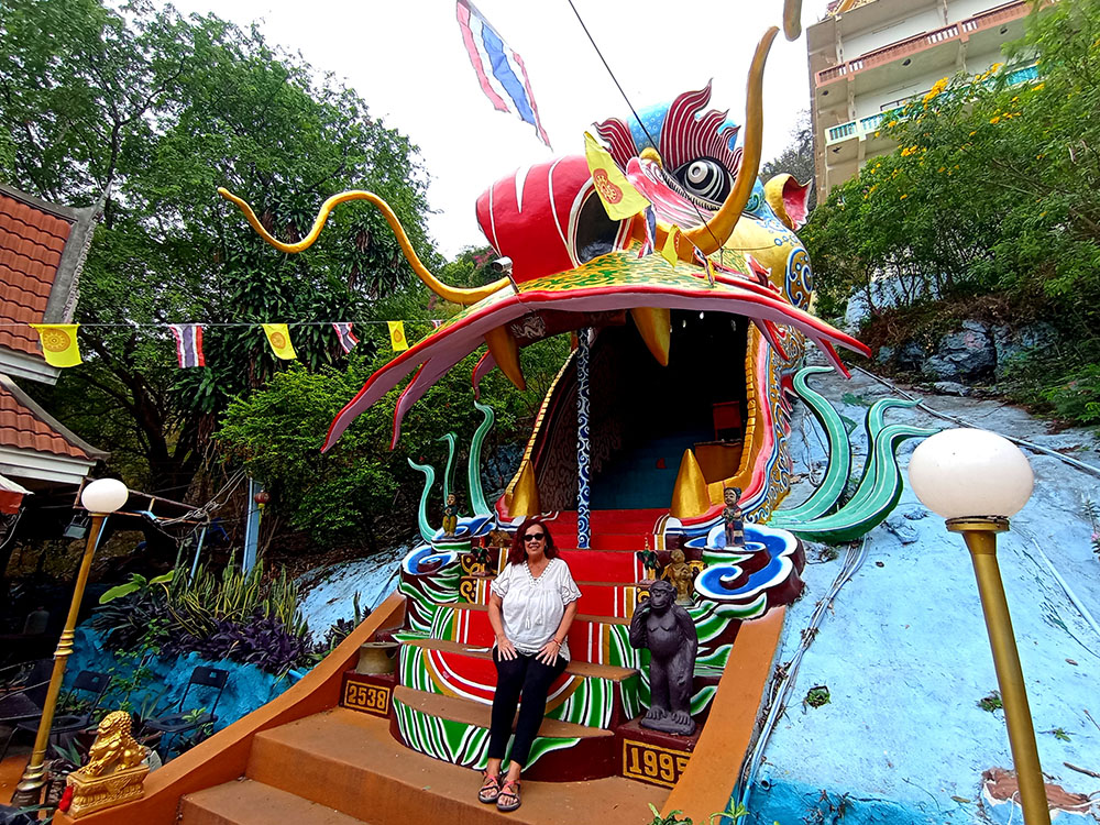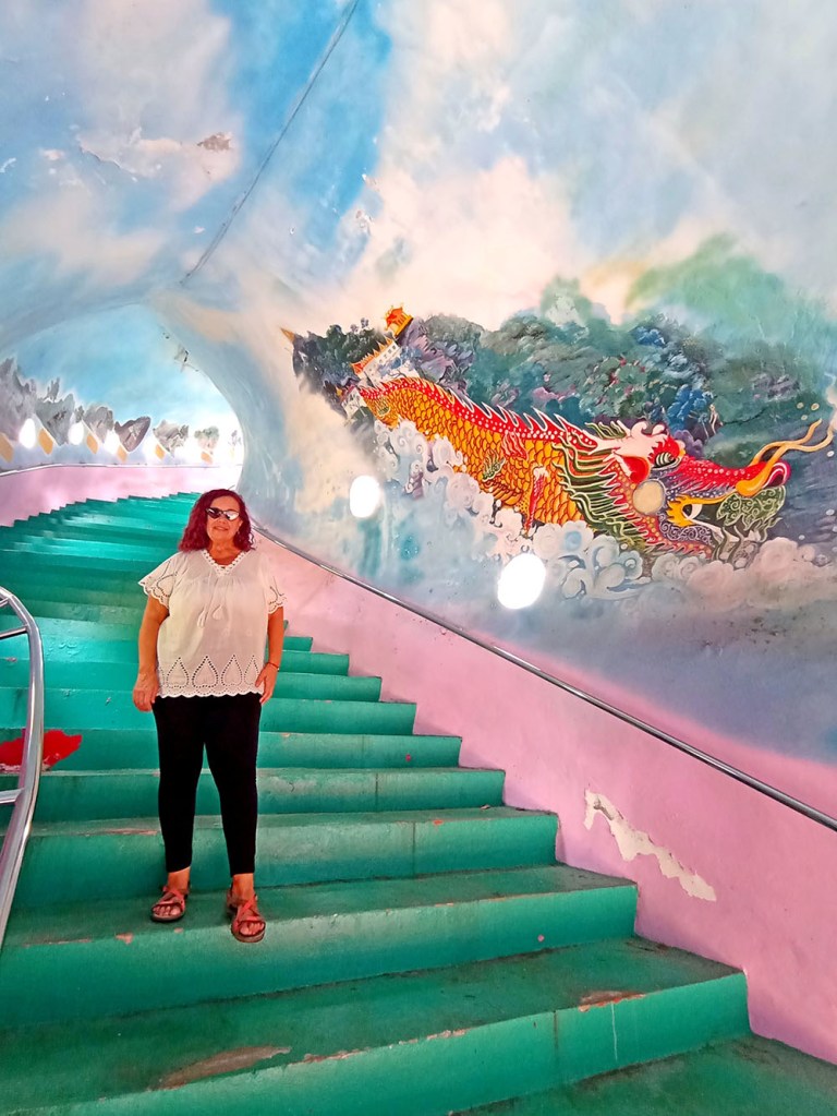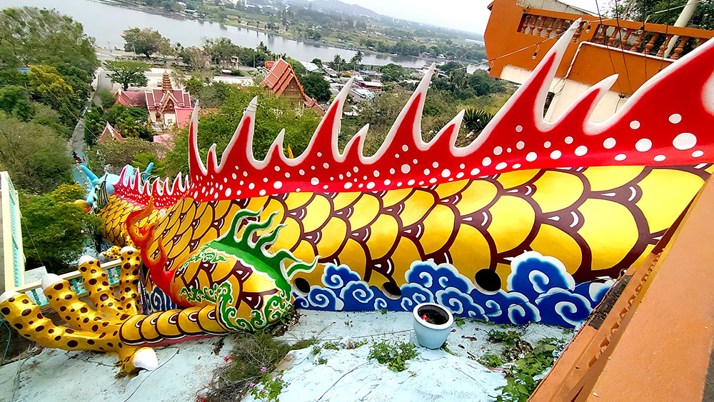 Desde la base, unas largas escaleras te conducen hasta la misma boca del dragón, la cual has de traspasar como si te engullera y seguir ascendiendo por el interior del cuerpo del dragón, pintado con distintos motivos y escenas de un poema del folclore tailandés, Khun Chang Khun Phaen.