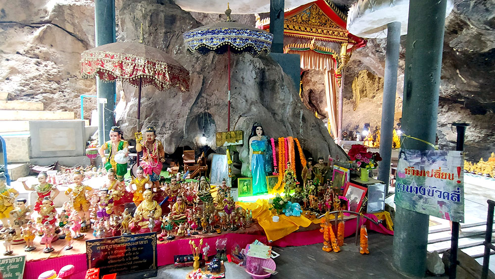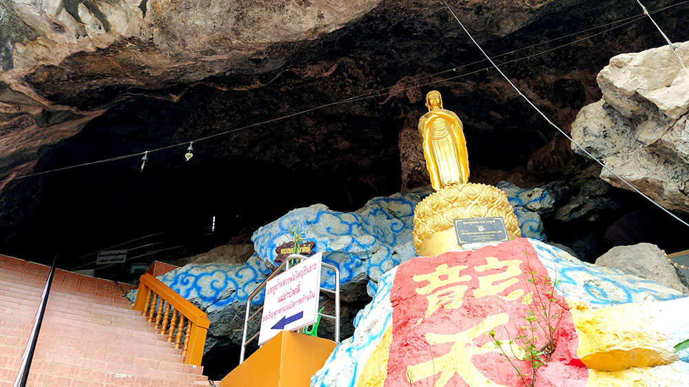 En el interior vemos una gran caverna de altos techos con un gran Buda rodeado de pequeñas imágenes, también de budas, ocupando el espacio principal. Desde este punto se puede continuar subiendo hasta llegar a la cima por una escalera de caracol. También se venera la imagen de una mujer pintada en una estalactita, se dice que alberga el espíritu de Bua Kli, una de las muchas consortes de Khun Paen, legendario gobernador y héroe épico e invencible de Kanchanaburi, irresistible en el amor y hábil en la magia. Cuando Bua Kli murió durante el embarazo, Khun Paen extrajo al niño no nacido para hacer un gumanthong, un poderoso talismán que hace que su portador sea inmune a todas las armas. El lugar se llena de juguetes y otras ofrendas de niños buscando la fertilidad o la abundancia en descendientes.