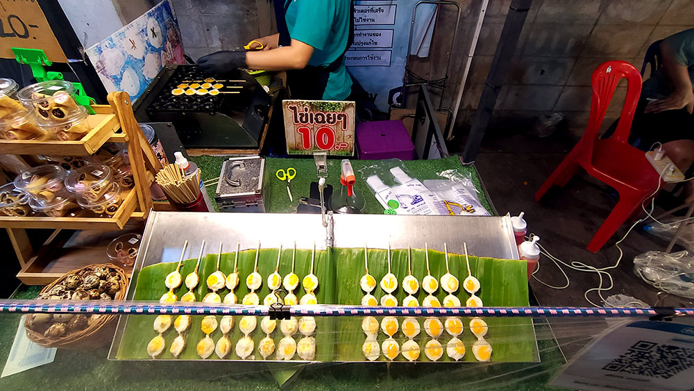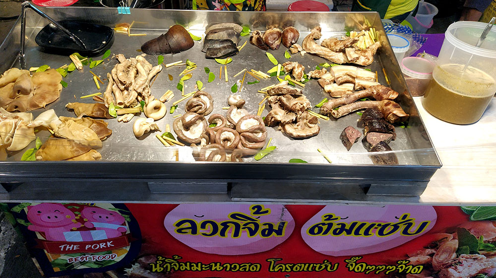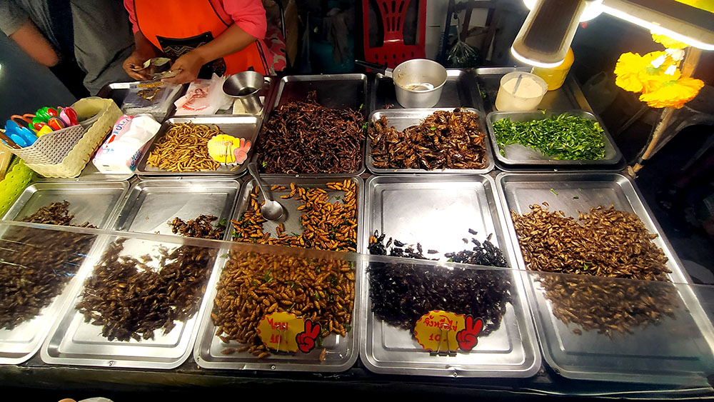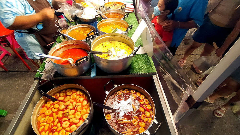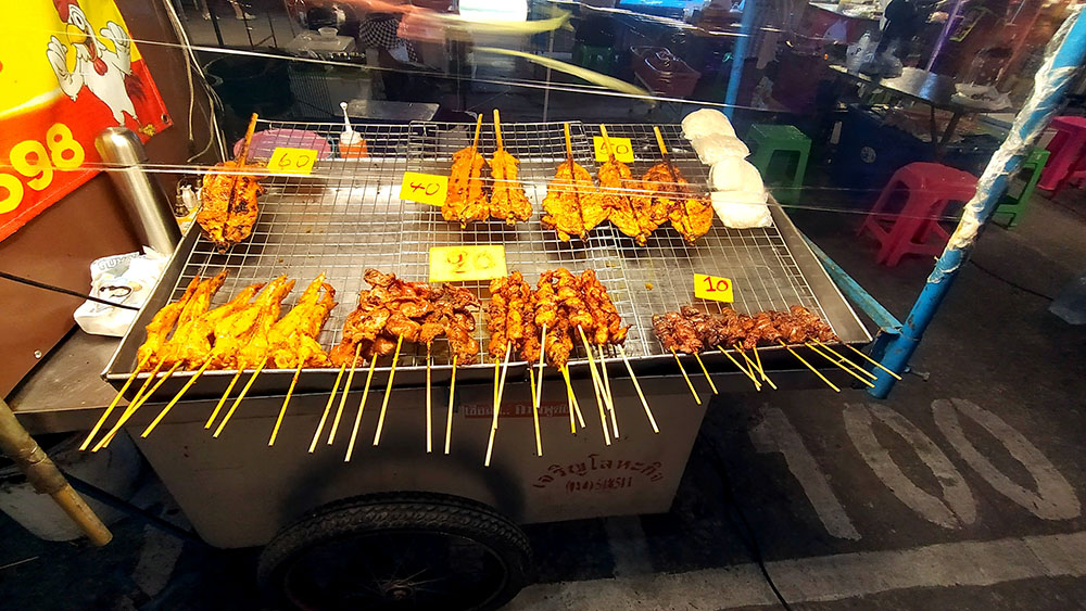 Justo al lado se agrupan los puestos de comida, donde puedes encontrar alimentos de todo tipo, desde las típicas brochetas, las alitas de pollo, los curries de todo tipo, ensaladas, frutas y dulces, calderos que rezuman olores increíbles, vísceras y mis preferidos los snacks de insectos