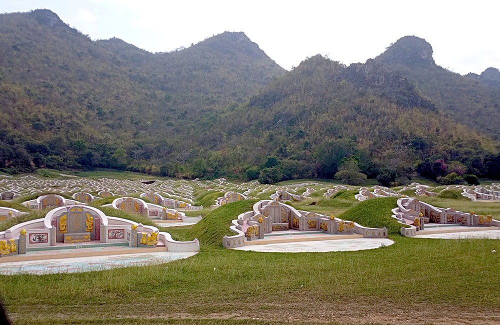 En dirección hacia el Templo del Dragón Dorado, encontramos este espectacular cementerio chino llamado Wang Hip Cemetery. Cada una de las tumbas se ubica bajo un montículo de césped. Según la tradición china, un cementerio es el último hogar después de la muerte. El lugar es espectacular hermoso, conmovedor, porque el río representa la riqueza que fluye, cuanto más violentamente serpentea, mejor, más rico se vuelve. En la parte posterior, hay montañas densamente elevadas que indican una estabilidad permanente. El color verde representa la fertilidad y la felicidad que desborda riqueza, prosperidad y brillantez. Los dos lados de la tumba representan dos brazos cálidos en un poderoso abrazo.