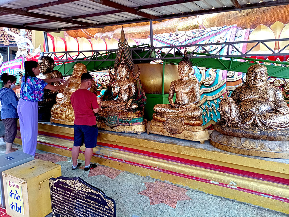 En la parte inferior de la gran estatua hay otras pequeñas imágenes de Buda donde los locales hacen ofrendas en forma de flor de loto, incienso y hojas de oro. También cuenta con una especie de carril con unos cuencos donde depositar donativos en forma de monedas.