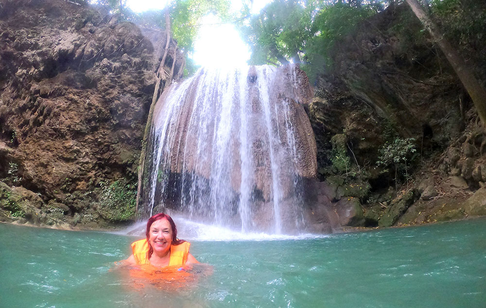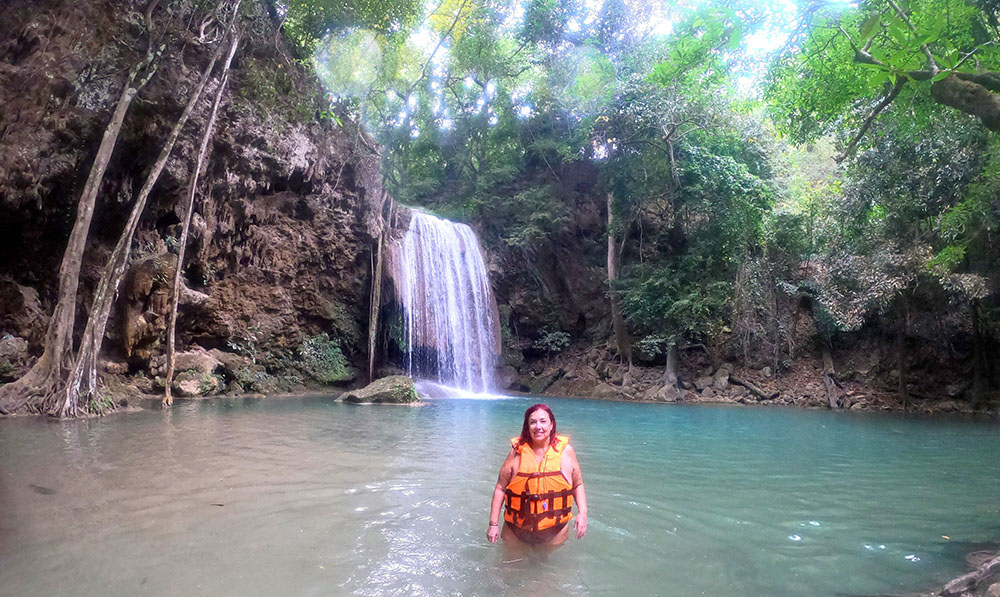 La segunda se encuentra a 170 m y se denomina Wang Mat Cha, aquí nos bañamos porque la poza era mayor y aunque había gente no estaba abarrotado, además hay una pequeña cueva debajo de la cascada. De repente sentíamos pequeños mordiscos en las piernas, tras el susto inicial, recordamos las piscinas de peces que limpian las pieles muertas por todo el Sudeste Asiático, aquí las teníamos gratis.
