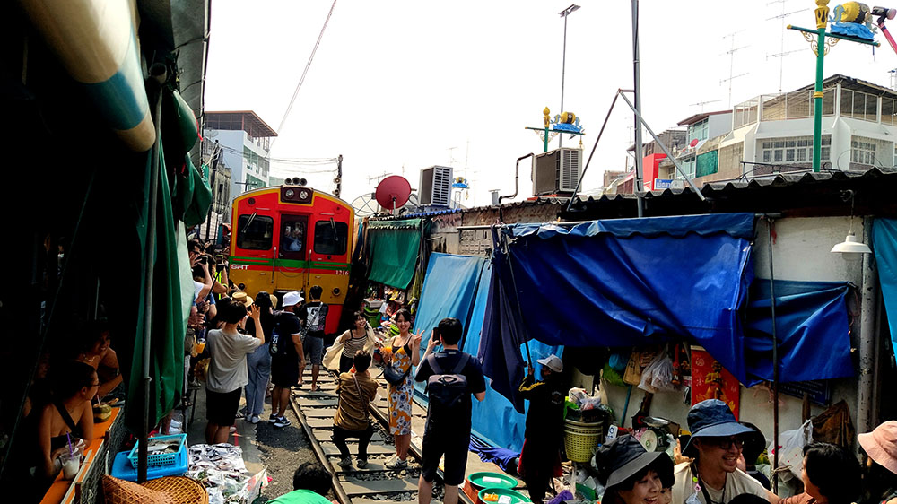 Cuando el tren se acerca a la zona de Talad Rom Hub, suena una sirena. Los vendedores con gran parsimonia, ajenos a todo lo que les rodea, simplemente cierran los paraguas o toldos justo a tiempo para que el tren pase y una vez que los supera los vuelven a abrir inmediatamente y continúan con las ventas. Es curioso que algunas mercancías, como frutas y verduras, quedan en los bordes de las vías y el tren simplemente pasa por encima de ellas.