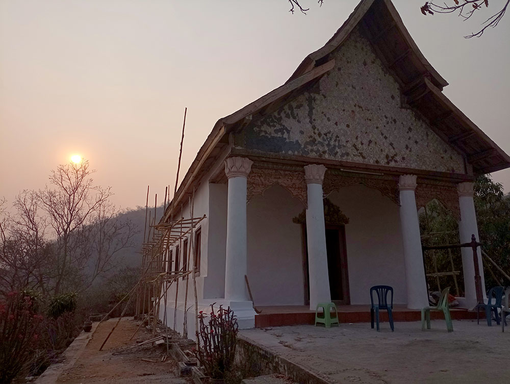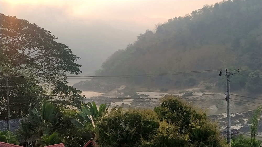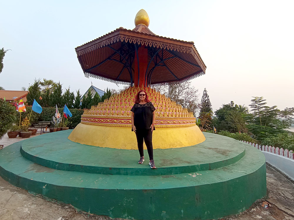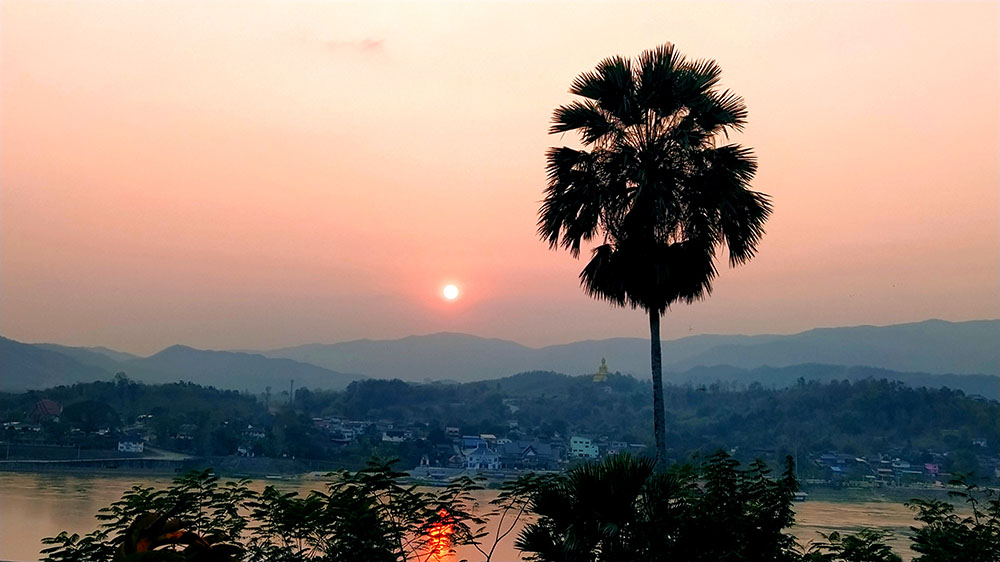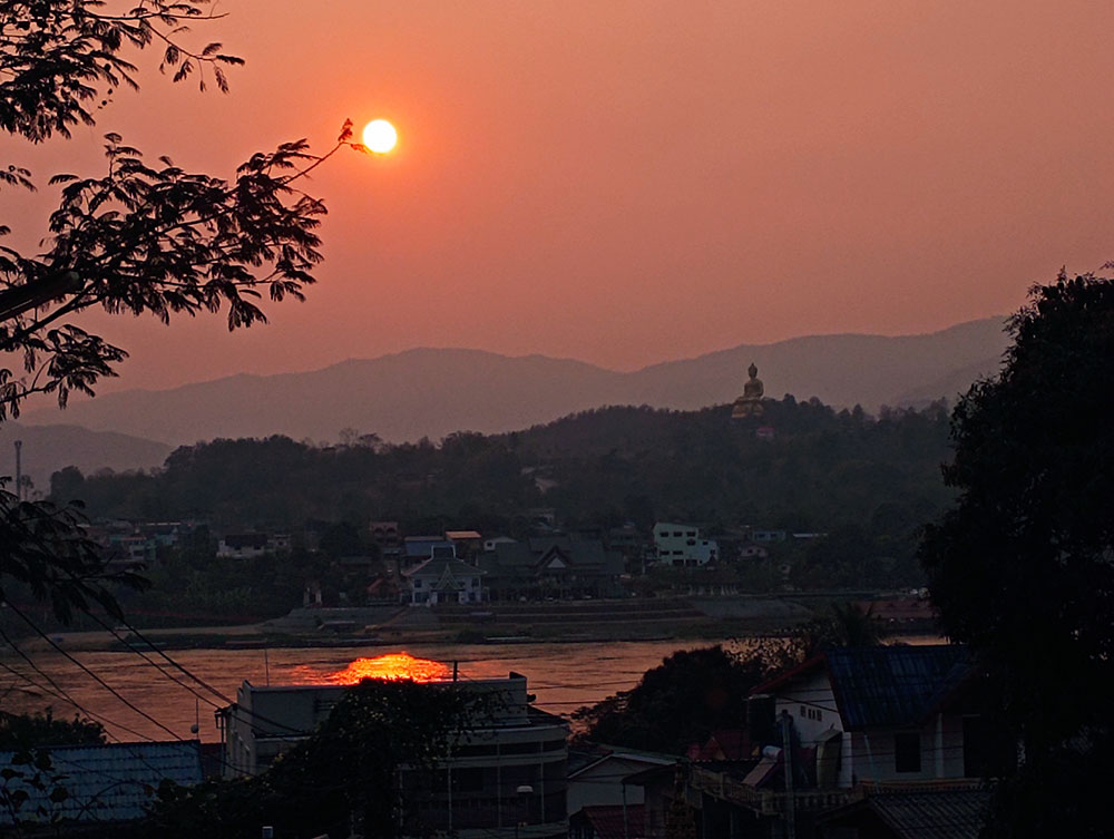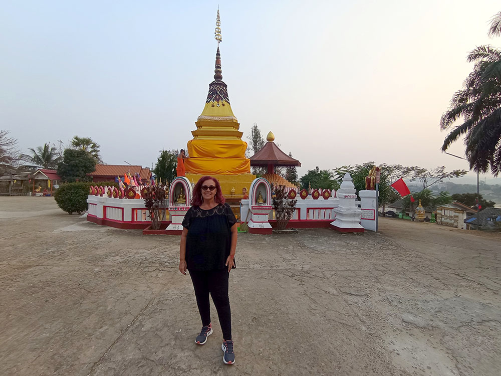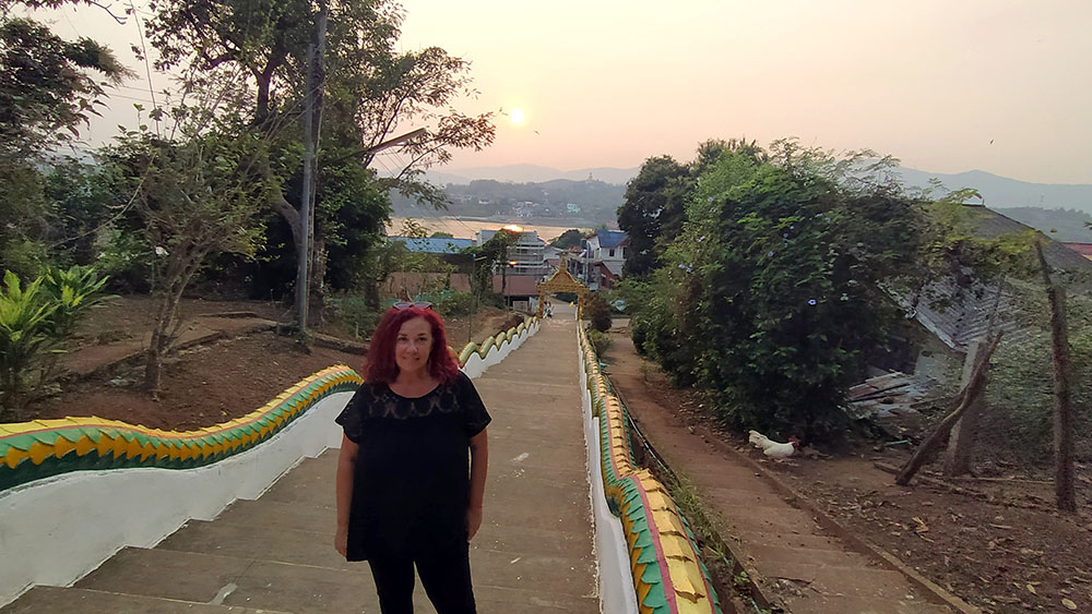 Aunque cansados después de las 6 o 7 horas de la aventura del paso de la frontera, compramos una tarjeta Sim Unitel (5G, 15 días) y reservamos en el hotel el billete del slow boat que nos llevaría hasta Luang Prabang, porque nos incluía el transporte hasta el embarcadero en tuk tuk al día siguiente. Una de las cosas que se puede hacer en el pueblo es ascender a una pequeña colina por unas escaleras con nagas, hasta donde se erige el monasterio Wat Jom Khao Manilat, construido estilo Shan en 1880. Desde la colina vimos el atardecer, fue espectacular.