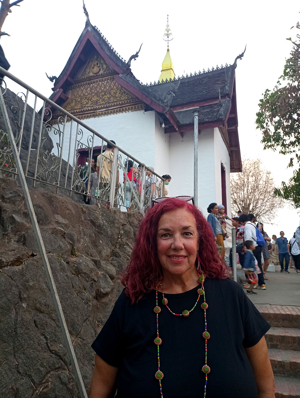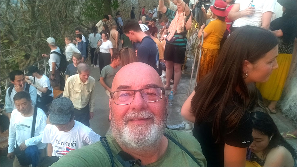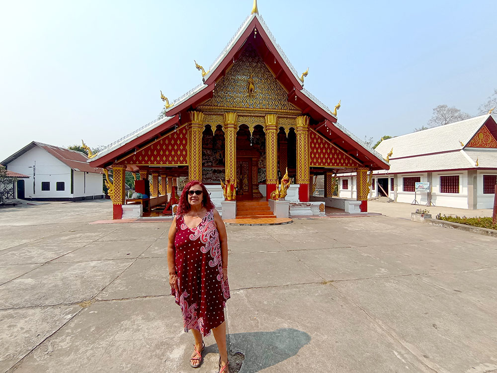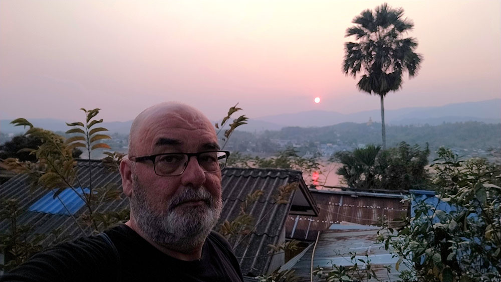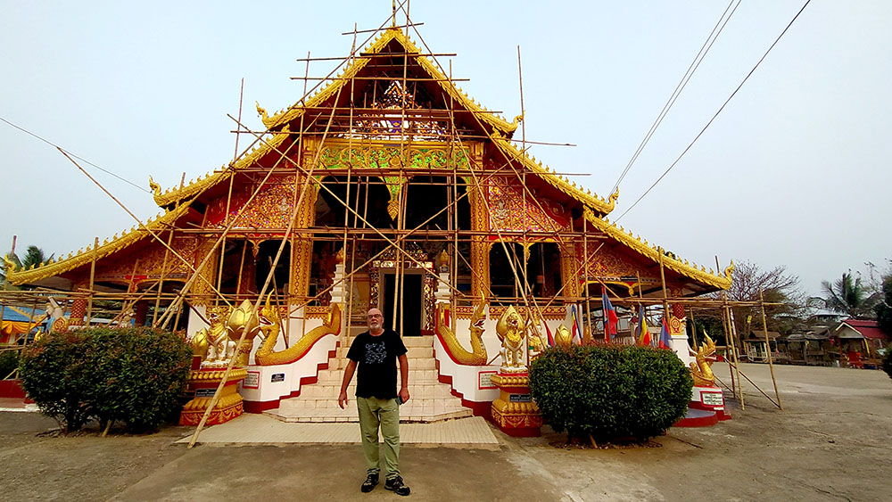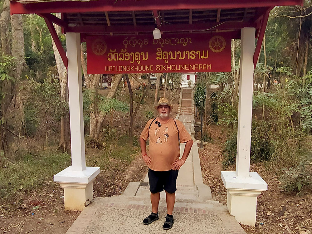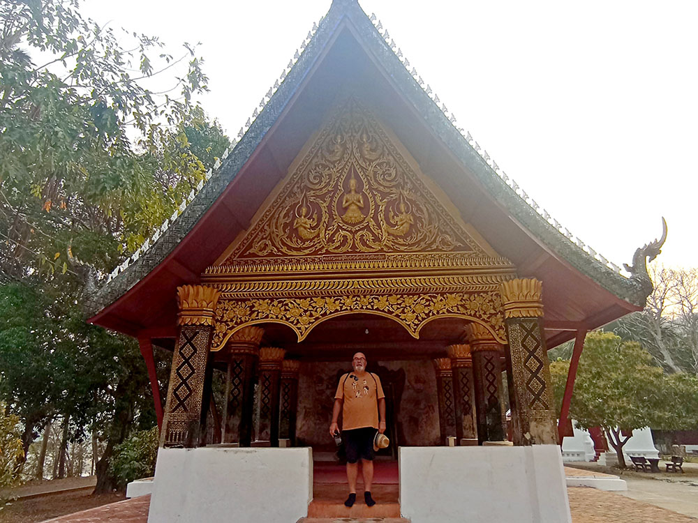 Aunque cansados después de las 6 o 7 horas de la aventura del paso de la frontera, compramos una tarjeta Sim Unitel (5G, 15 días) y reservamos en el hotel el billete del slow boat que nos llevaría hasta Luang Prabang, porque nos incluía el transporte hasta el embarcadero en tuk tuk al día siguiente. Una de las cosas que se puede hacer en el pueblo es ascender a una pequeña colina por unas escaleras con nagas, hasta donde se erige el monasterio Wat Jom Khao Manilat, construido estilo Shan en 1880. Desde la colina vimos el atardecer, fue espectacular.