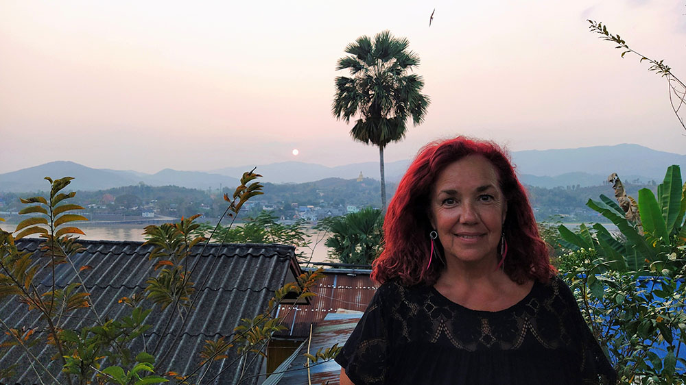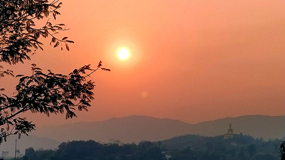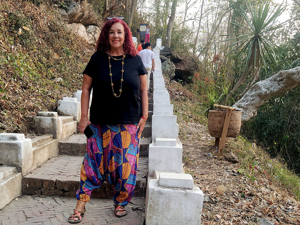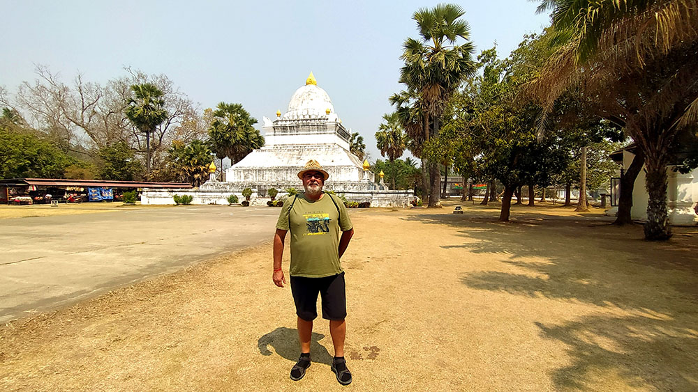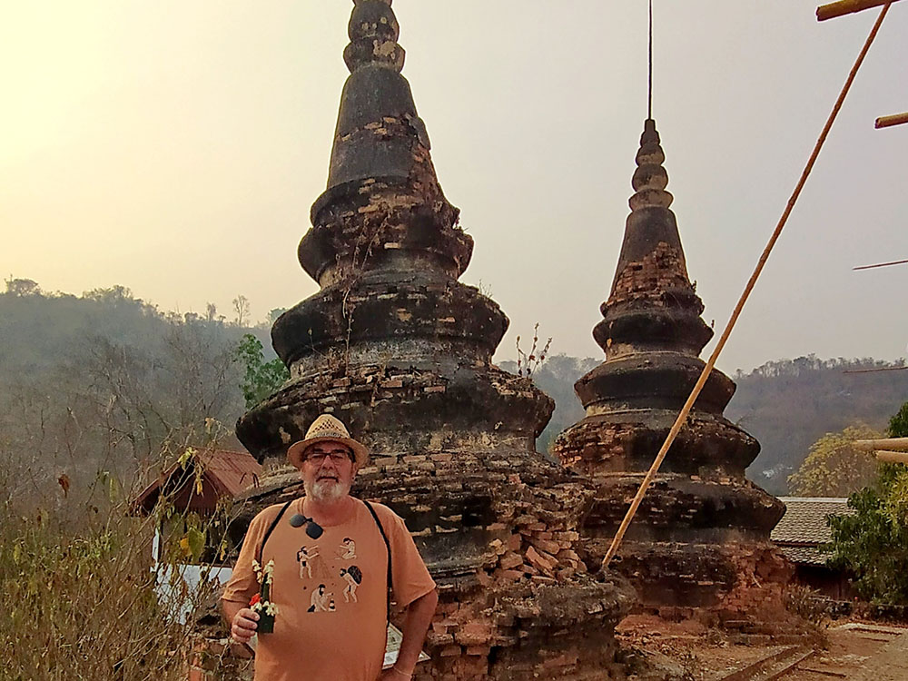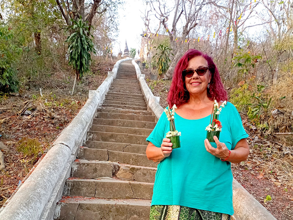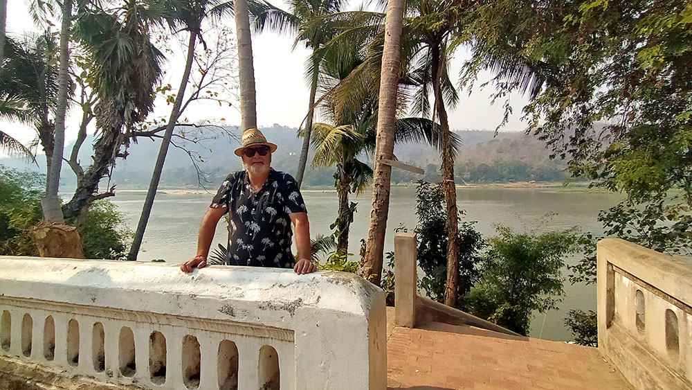 Aunque cansados después de las 6 o 7 horas de la aventura del paso de la frontera, compramos una tarjeta Sim Unitel (5G, 15 días) y reservamos en el hotel el billete del slow boat que nos llevaría hasta Luang Prabang, porque nos incluía el transporte hasta el embarcadero en tuk tuk al día siguiente. Una de las cosas que se puede hacer en el pueblo es ascender a una pequeña colina por unas escaleras con nagas, hasta donde se erige el monasterio Wat Jom Khao Manilat, construido estilo Shan en 1880. Desde la colina vimos el atardecer, fue espectacular.