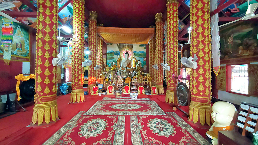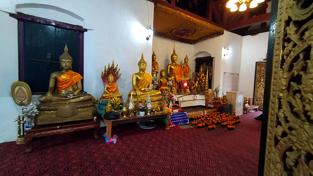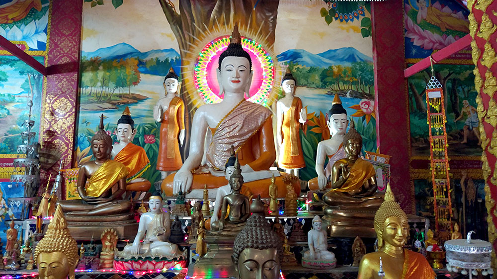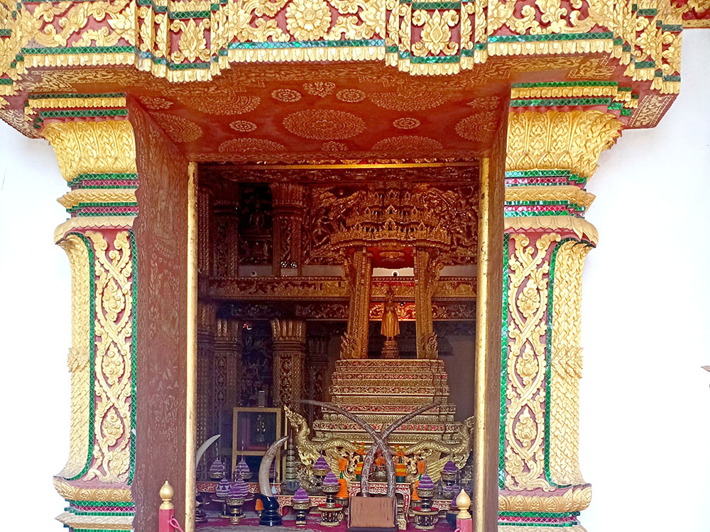 Dejamos el trasbordador y atravesamos el pueblo de Ban Xieng Maen hasta encontrar los escalones al Wat Chomphet, compramos unas ofrendas y subimos, la sobria edificación data del siglo XVIII y las vistas son esplendidas. Continuamos hacia nuestro siguiente templo, el Wat Long Khoum. Te reciben unos guardianes chinos pintados en la entrada, dentro destacan la pinturas de las paredes y el techo de oro. Había muchos más templos pero teníamos que regresar, el atardecer nos acechaba.