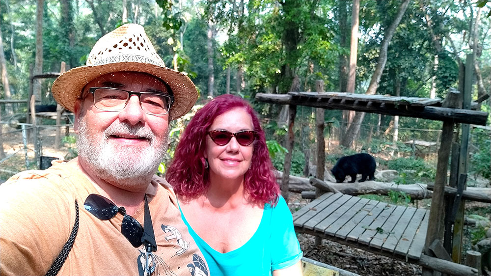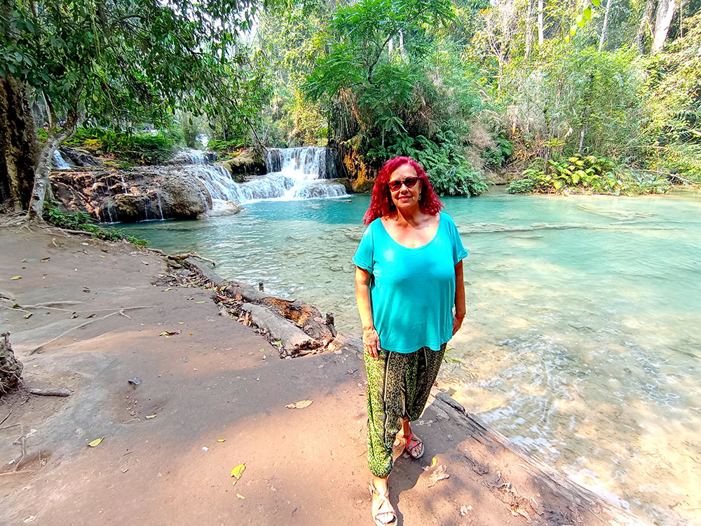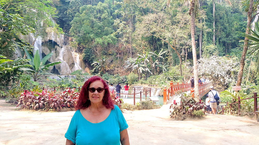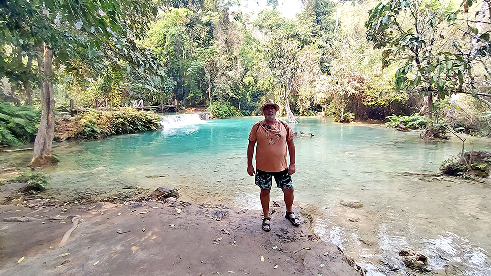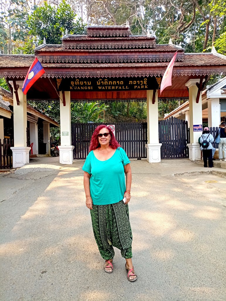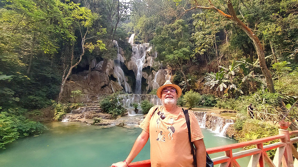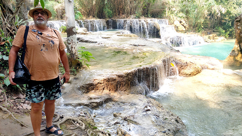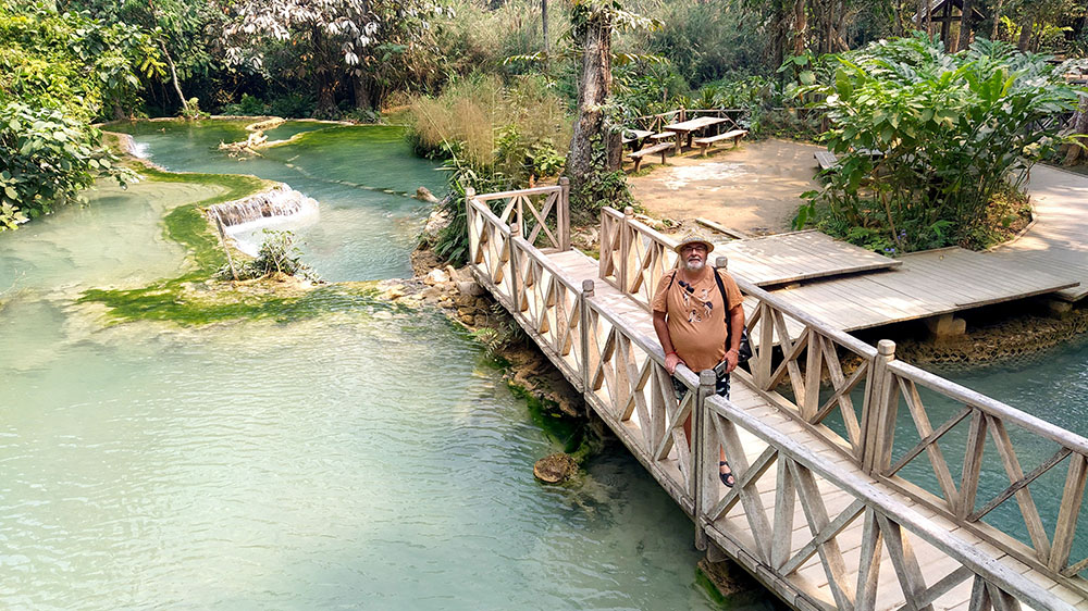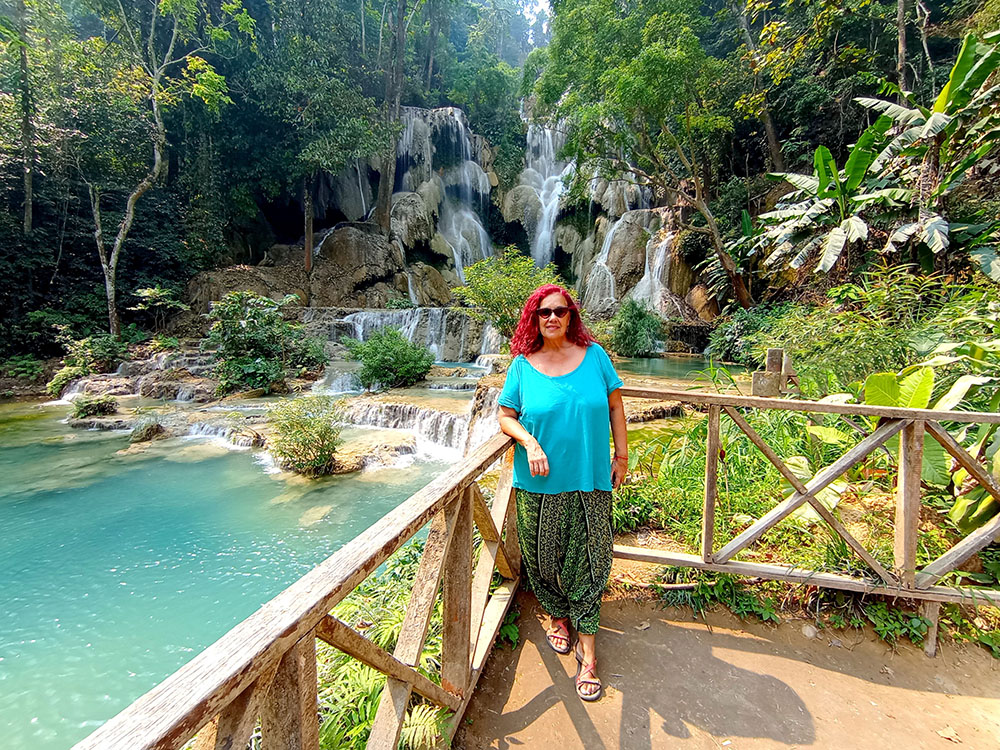 Una de las excursiones que se pueden realizar desde Luang Prabang es visitar las Cascadas de Kuang Si, situadas a unos 25 kilómetros. Nosotros negociamos la excursión en la calle y nos llevaron en songthaew (450.000 kip2023) hasta la entrada. Después de adquirir el ticket (25.000 kips2023) unos carritos eléctricos te dejan en la entrada. Un plano detallado te indica los senderos que debes tomar. Lo primero que vemos es el Centro de Rescate de Osos Tat Kuang Si, dedicado al rescate del oso negro asiático. A continuación, rodeados de árboles y selva, vamos ascendiendo por una ligera pendiente, en algunos casos por tarimas de madera, por tres niveles de cascadas y pozas, donde en algunas puedes darte un chapuzón, hasta llegar a la última de 60 m de altura. Aquí se ha construido un puente en la base de la cascada, sobre el curso del agua, desde donde se obtienen las mejores vistas.